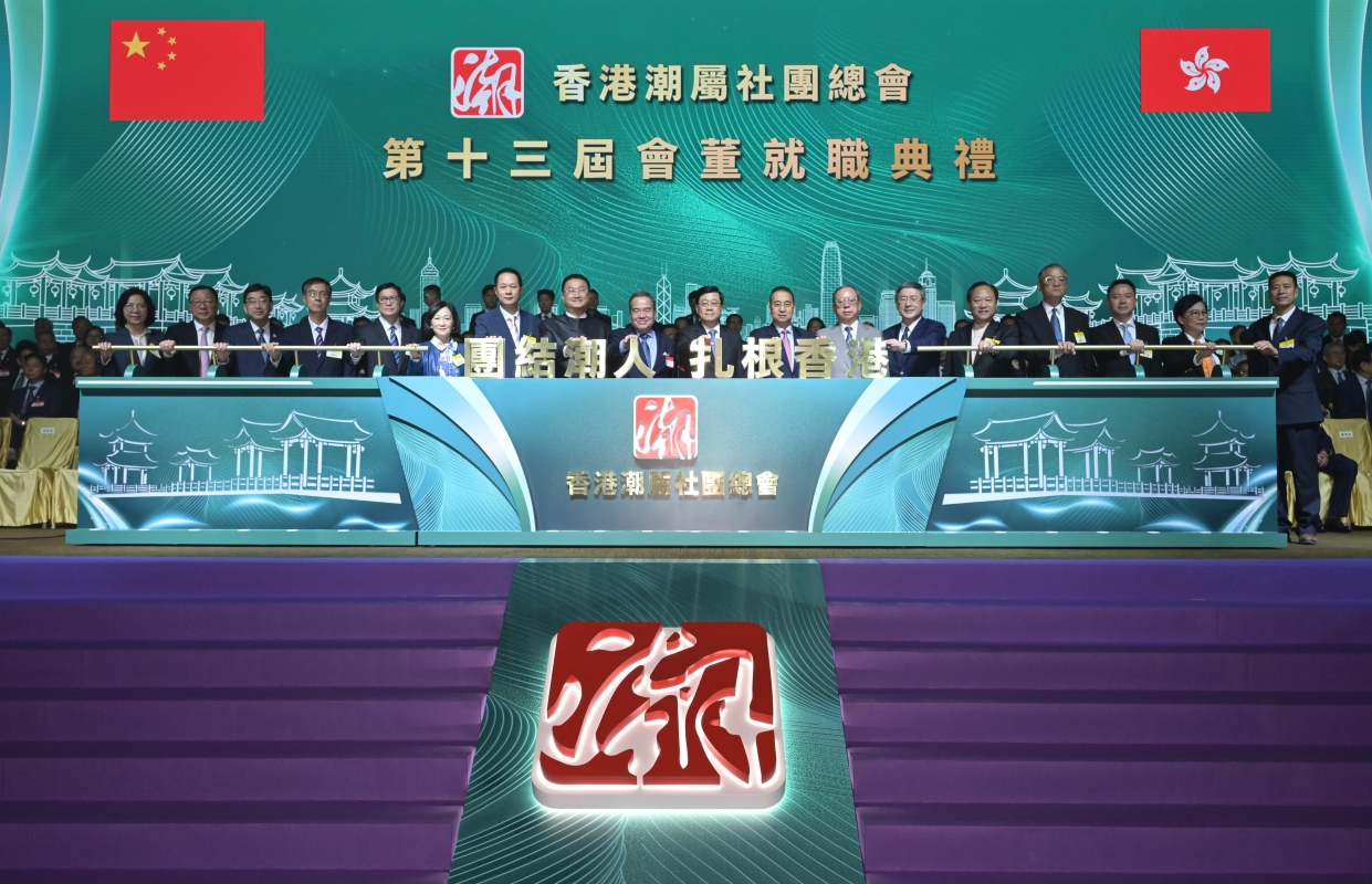 香港潮屬社團總會主席胡定旭在致辭中,明確潮總未來將聚焦青年、婦女與文化傳承三大發展方向,凝聚全港百餘萬潮籍鄉親力量,全力支持特區政府施政,助力香港社會安定、經濟繁榮。一是青年委員會引領青年了解國際形勢、深入認識祖國、主動融入國家發展大局;二是婦女委員會將從專業、慈善、婦女自強、跨領域合作等方面,推動女士多方位參與社會工作與國家建設;三是弘揚潮州文化,保育國家級非物質文化遺產“香港潮人盂蘭勝會”,傳承中華傳統美德。同時,依托潮總作為國際潮團總會常務理事單位的優勢,搭建內地與香港、中國與世界的溝通橋梁,講好中國故事、香港故事、潮人故事。