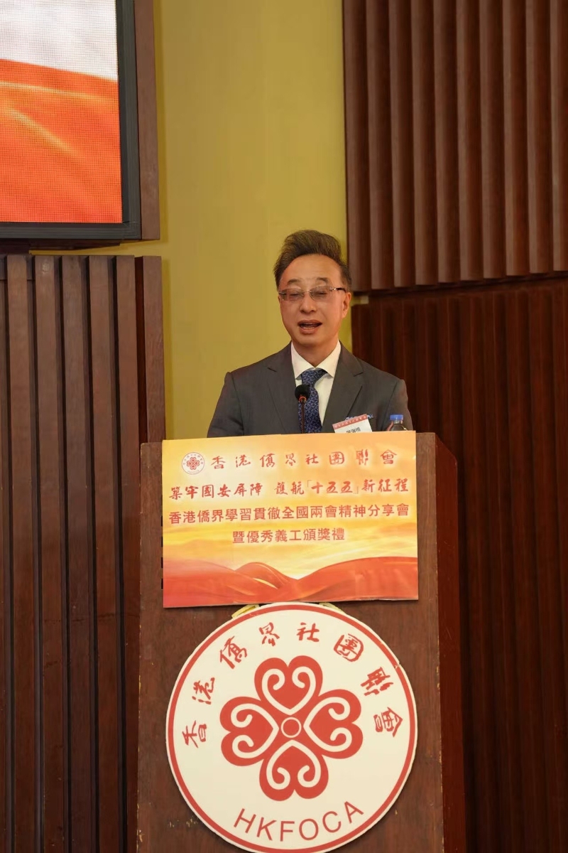 黃楚基致歡迎辭時表示,是次分享會核心在於學習貫徹兩會精神,凝聚僑心僑力,服務國家發展大局。香港僑界作為連接中外的橋樑,需發揮獨特優勢:深度融入粵港澳大灣區建設,助力“一帶一路”高質量發展,講好中國與香港故事。同時,必須強化國家安全觀念,堅定支持特區政府依法施政,維護“一國兩制”行穩致遠。未來,香港僑界社團聯會將深化兩會精神宣講,培育青年僑才;搭建交流平台,促進海內外資源對接;認真履職建言,架好橋樑紐帶,為“十五五”良好開局及中國式現代化建設貢獻僑界力量。 主禮嘉賓胡健民致辭時表示, 安全是發展的前提,發展是安全的保障。維護國家安全,要確保愛國者治港,完善選舉制度,加強愛國主義教育。香港正首次制定五年規劃,對接國家“十五五”,爭取年底完成。他呼籲僑界支持、發揮國際化平台優勢,共同建設更美好、更繁榮、更安全的香港,融入國家發展大局。 主禮嘉賓高峰分享了全國兩會中與僑胞相關的重點內容,肯定香港僑界在不同歷史時期的貢獻,並對香港僑界提出三點建議:把握“十五五”規劃發展機遇,為香港高質量發展貢獻力量。發揮橋梁紐帶作用,助力香港更好融入和服務國家發展大局。堅持以人為本,增進僑界同胞民生福祉。 高峰同時表示, 2026年中國僑聯迎來成立70周年,將舉辦系列活動,進一步凝聚僑心僑力,建功“十五五”。 活動同時舉行義工嘉許禮,主禮嘉賓高峰、 徐小林與黃楚基、 余國春、 吳換炎及多位港僑聯會領導向義工頒獎。 香港僑界社團聯會常務副會長、義工團團長陳志煒致辭時表示,義工們用關愛行動詮釋香港僑界同胞愛國愛港,團結互助精神。嘉許禮表彰114位優秀義工。其中金獎獲獎者為林秉雄、鄭玉蘭;青年義工金獎獲獎者為張銀凱、關穎思;銀獎獲獎者為黃斌、卓淑嫻、陳岡、陳嘉琳、范增釵;銅獎獲獎者為陳東潔、劉亞麗、范慧琍、楊鬧英、李秀桂、黃子陵、江麗元、李月芬。(完) 【編輯:張明臻】