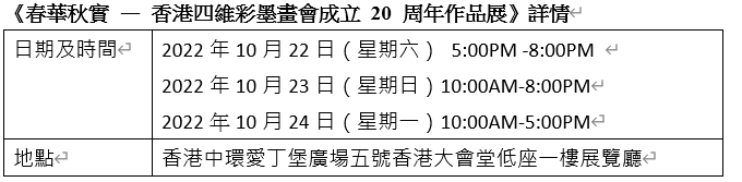 《春華秋實——四維彩墨成立20周年會員作品展》 66位彩墨畫家藝術見真情香港新聞網10月20日電 當代著名彩墨畫家林天行,與一群師從他、熱愛藝術的學生創立之“四維彩墨”畫會,今年成立20周年,將在香港大會堂低座一樓展覽廳,舉行《春華秋實 — 四維彩墨成立20周年會員作品展》。 林天行獨樹一格的彩墨作品,聞名中外,廿多年來在全球各地舉辦主題個展無數,作品極具感染力,吸引不少本港菁英拜師習畫,《春華秋實 — 四維彩墨成立20周年會員作品展》將展出林天行的最新彩墨畫作及書法作品。 展覽同時亦展出近200幅、來自66名“四維彩墨”會員的彩墨及書法作品,林天行因材施教,學生年齡橫跨3歲幼童以至花甲之年,當中包括不少專業人士包括醫護界、法律界、金融會計界、教育界、演藝界、公務員、以至來自多國的外籍人士等等,他們均在林天行老師的啟導下,以自身的體驗,通過學習、修鍊,創作出風格迥異的真情書畫作品,在彩墨世界中大放異彩。 “四維彩墨”中的“四維”兩字,意義深遠,是林天行對其學生們的一種培養、冀盼及要求,他認為,人生是立體的,但人生若只有“知識”、“技能”、“事業”這“三維”,仍然未能完善,需添上第四個維度—“審美”才能成為全人,那是藝術精神的維度,是心靈建設、人生中不可或缺的精神食糧。 今年是香港回歸祖國25周年,去年國家“十四五”規劃把香港定位發展為“中外文化藝術交流中心”,林天行認為,要達至這個目標,香港需要全面發展藝術教育,培養香港新生代有藝術思維、藝術的眼界、創作出突破性的藝術作品至為重要,他期盼新一屆香港特區政府成立全新“文化體育及旅遊局”、加上各藝術機構、畫會以至本港藝術家們的全力推動,令本港藝術整體發展大步向前。 開幕禮詳情如下: 日期:2022年10月22日(星期六) 時間:5:00pm 地點:香港中環愛丁堡廣場五號香港大會堂低座一樓展覽廳