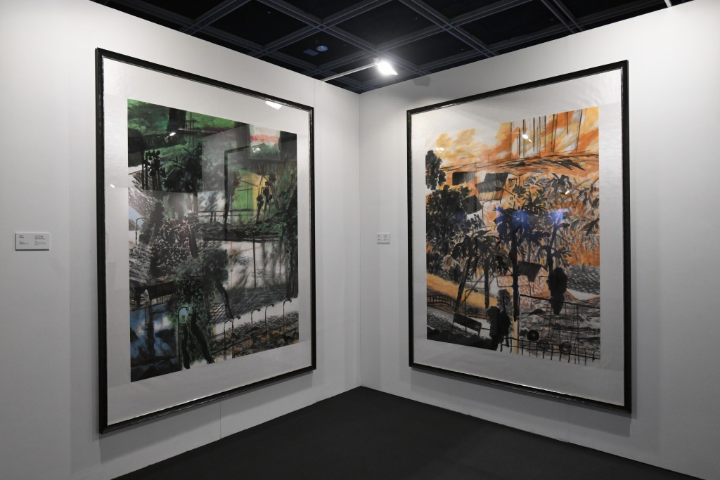著名香港畫家林天行和他的新作《新界日出》 在“當代藝術展區”中,以畫荷花聞名的著名畫家林天行在展覽中帶來五幅新作。林天行介紹說,他的工作室位於葵涌,故今次作品均以從工作室窗外看到的風景為題材。他表示由於工作室面對青山公路,每天從窗往外看都是車來車往,每天的景色有所不同,令他每天的心境亦有所變化。其中一幅作品名為《新界日出》,在顏色上利用重彩,並利用“點”構成畫面,展現香港充滿動感活力的一面。