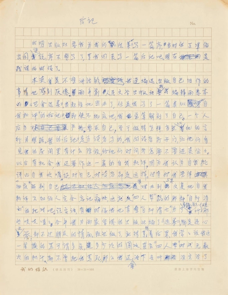 巴金選集後記 圖源:香港蘇富比 寫有《家》、《春》、《秋》等小說的巴金是中國“五四”運動以後最著名作家之一,相信不用再多作介紹。這次預展會展出巴金於香港昭明出版社出版《巴金選集》親自選編編目和後記,寫於1980年,包含他在選輯方向之考量。這篇後記只有在這一個版本的《巴金選集》中出現過。