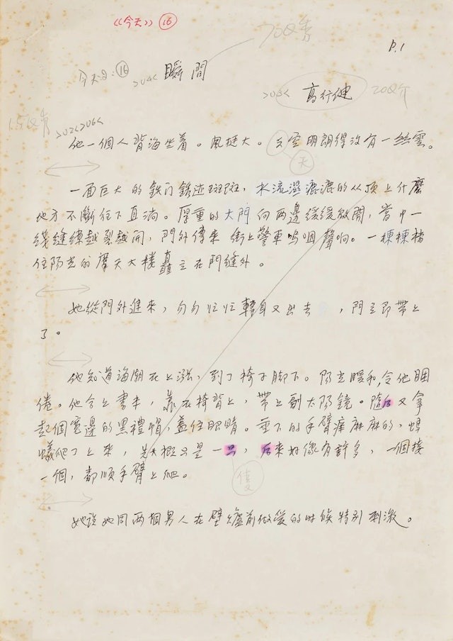 《瞬間》首頁手稿 圖源:香港蘇富比 若想捕捉作家思緒變化,便不能錯過作品初稿。展覽另一焦點在高行健短篇小說《瞬間》手稿。高行健是首位獲諾貝爾文學獎殊榮的華人作家,在江西出生,後來與80年代前往巴黎定居。在巴黎期間他創作過許多實驗性作品,《瞬間》便是其中代表作之一。 讀過高行健作品的讀者,相信會對其“意識流”創作印象深刻。這個特色亦在《瞬間》文稿中有所展現,《瞬間》原為拍攝電影而作,以不同敍述角度組成片段,情節不連貫、片段互相跳躍,充滿戲劇感,如同在文本上看見蒙太奇剪輯。文稿原本只有五千多字,最後出版定稿字數逾萬,許多文句被加長,也有一些被刪減。 除了名家手稿,這次也展出作家之間往來多件信札,從七十年代開始,時間跨度約40年。史學大師余英時、金庸、倪匡、羅孚與董橋之書信往來都收錄其中。除了能在信札中看到余英時與董橋之間深厚情誼,更能看到董橋與倪匡之間的好玩對話,各文學大師性格形象躍然紙上。