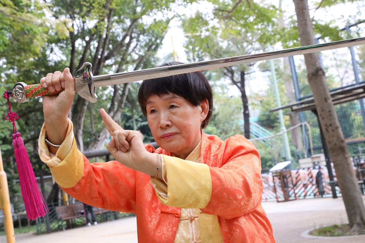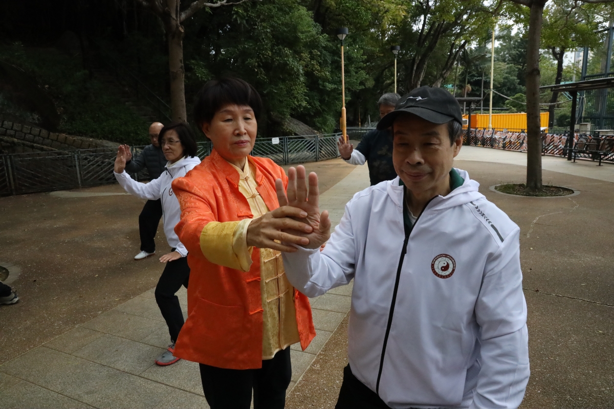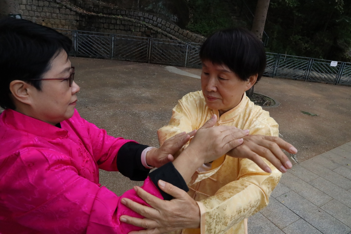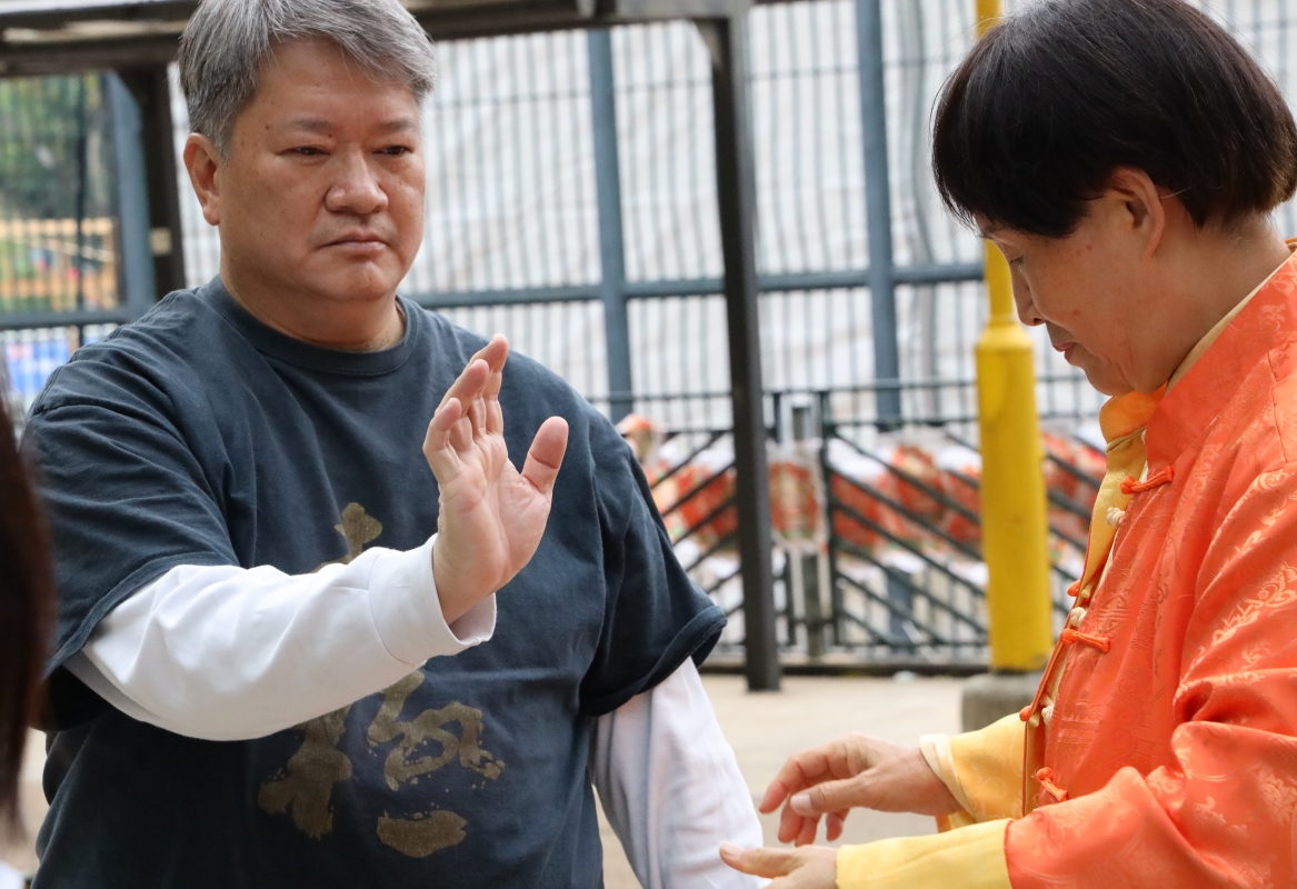 董鄭小芬師傅在旺角花墟公園教導學生。