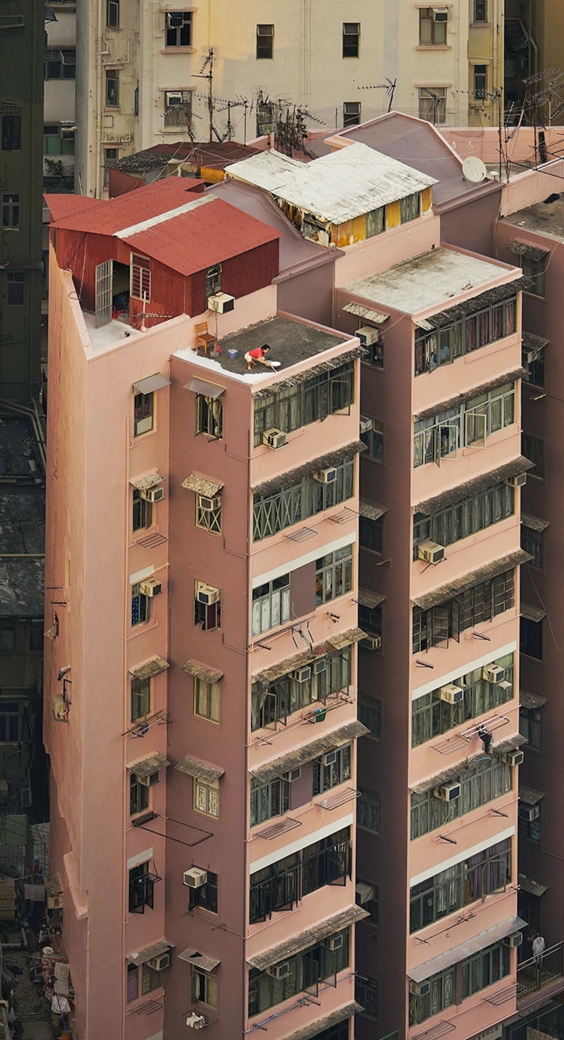 圖源:Romain Jacquet-Lagrèze 《Concrete Stories》 修理天線的人、伏地挺身的人、打太極拳的人,當日出或日落的光線降臨,日常時刻在簡陋的空中庭院展開,與繁榮的香港形象產生強烈的對比。有時,當 Romain 拿著相機全神貫注拍照,他會意外地發現自己也成了被窺視的對象。“無論何時當你站在露天屋頂上,你都知道有無數扇窗戶可能在看著你。”
