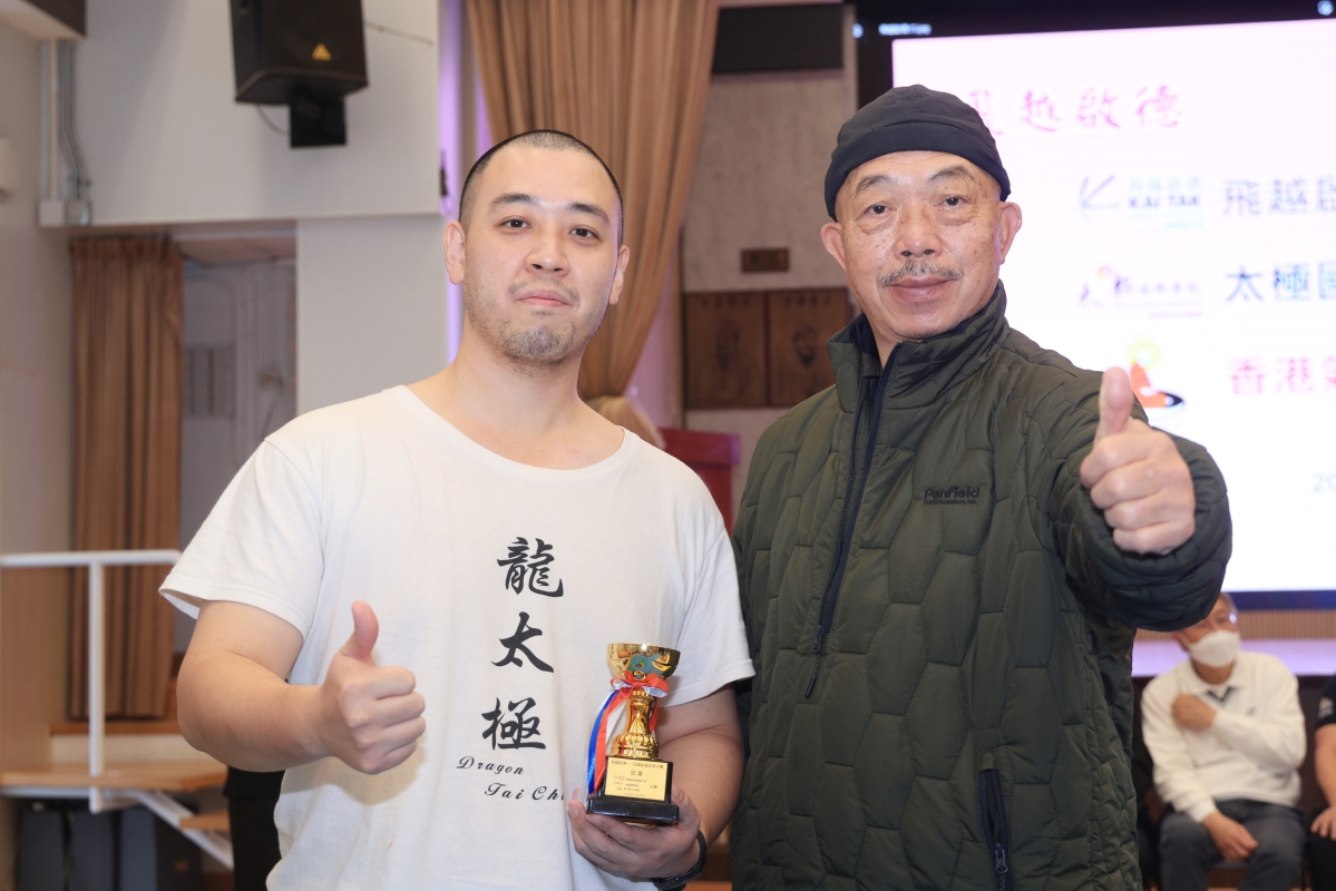 太極名師施雄鵬(右)與獲得90公斤級以下的冠軍夏啟龍。