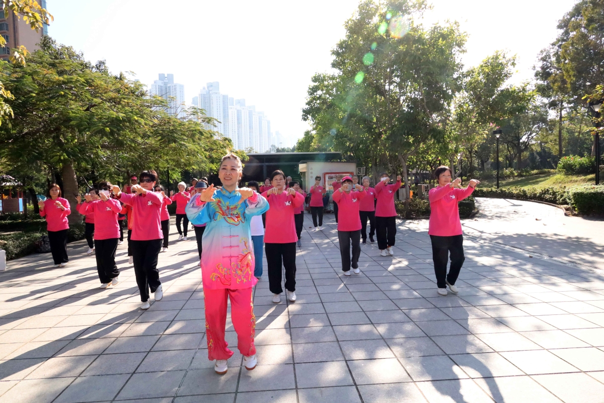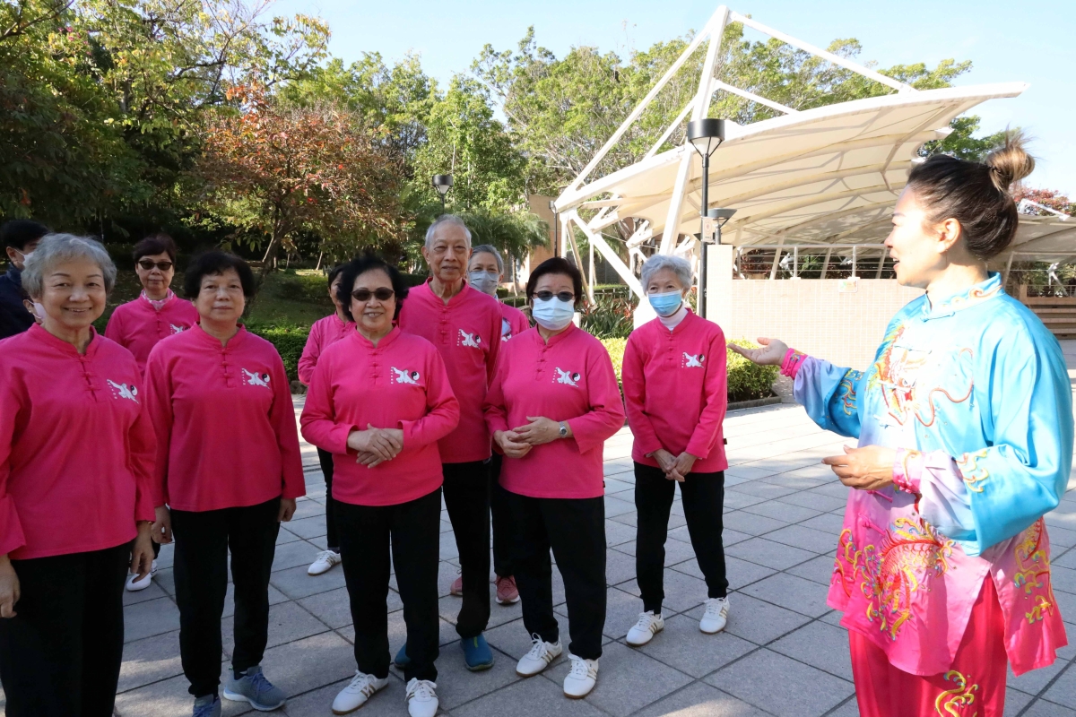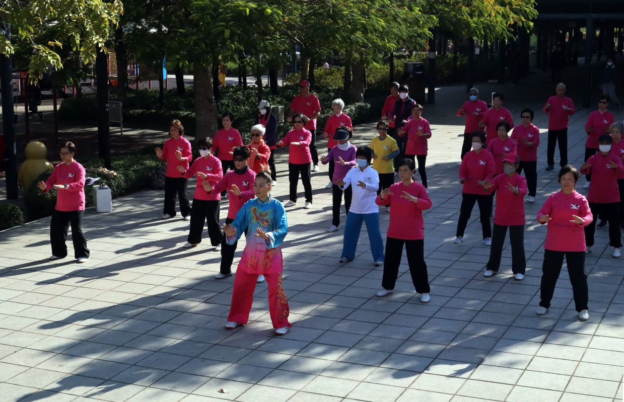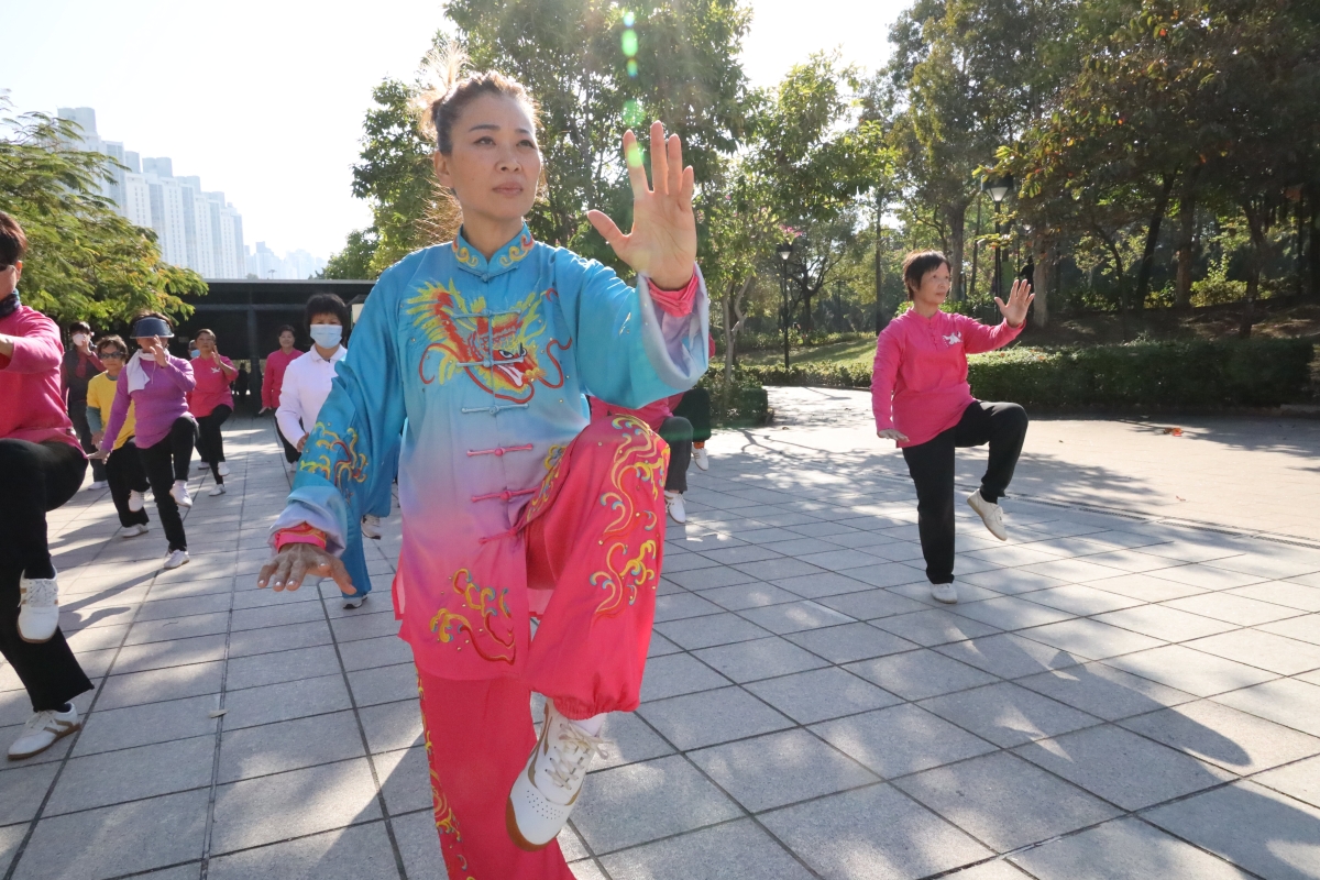 “開心太極坊”成員,正跟隨麥瑞芳師傅一招一式、環環入扣、人景合一。