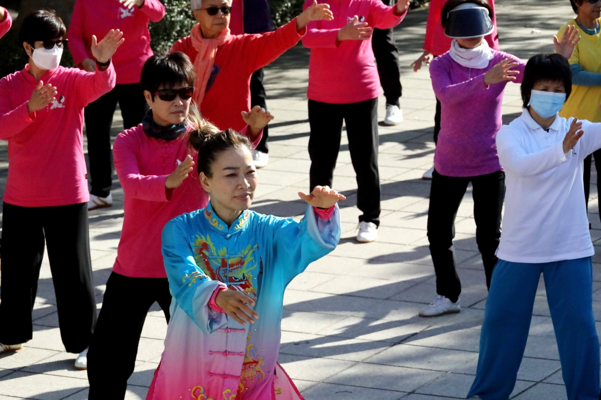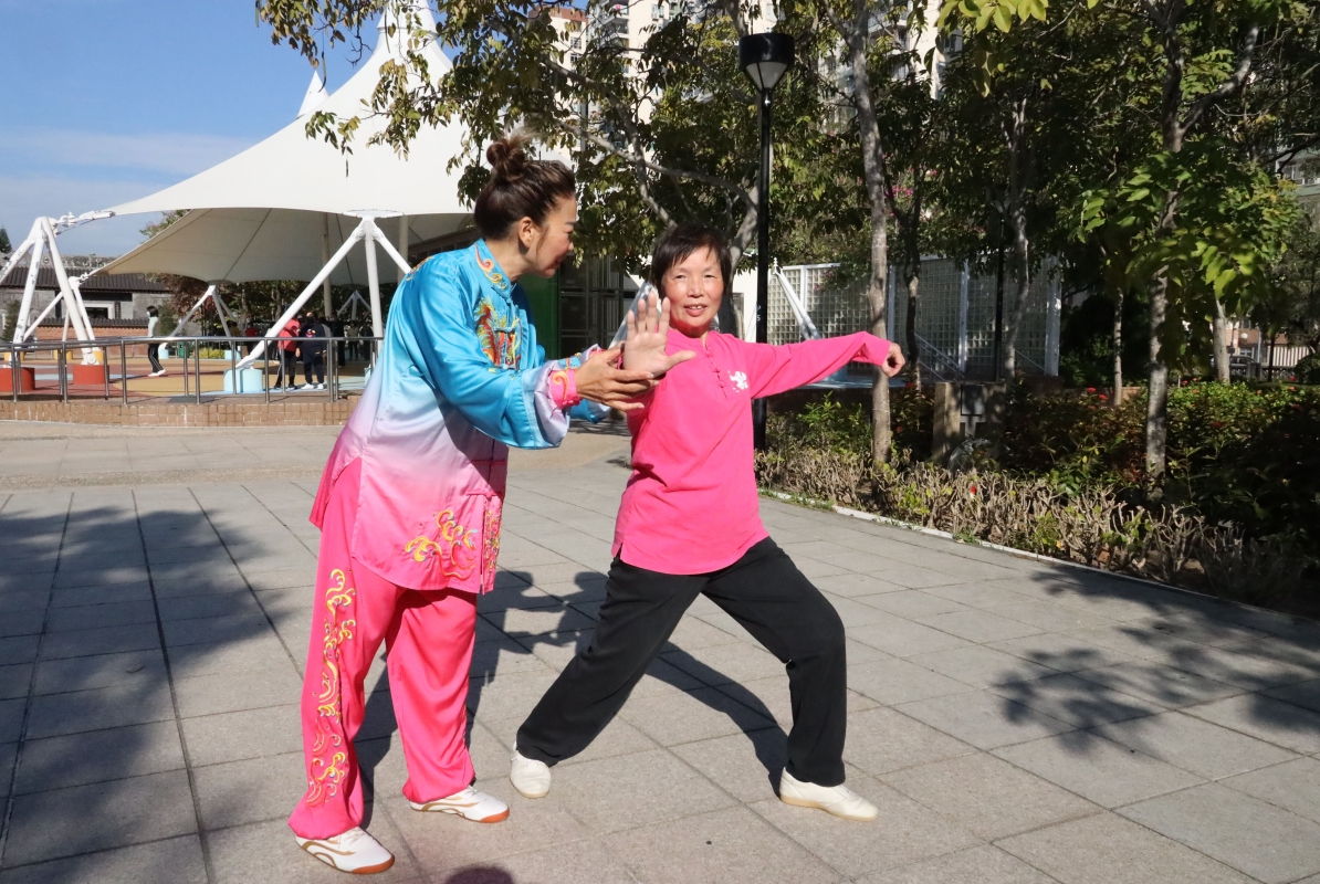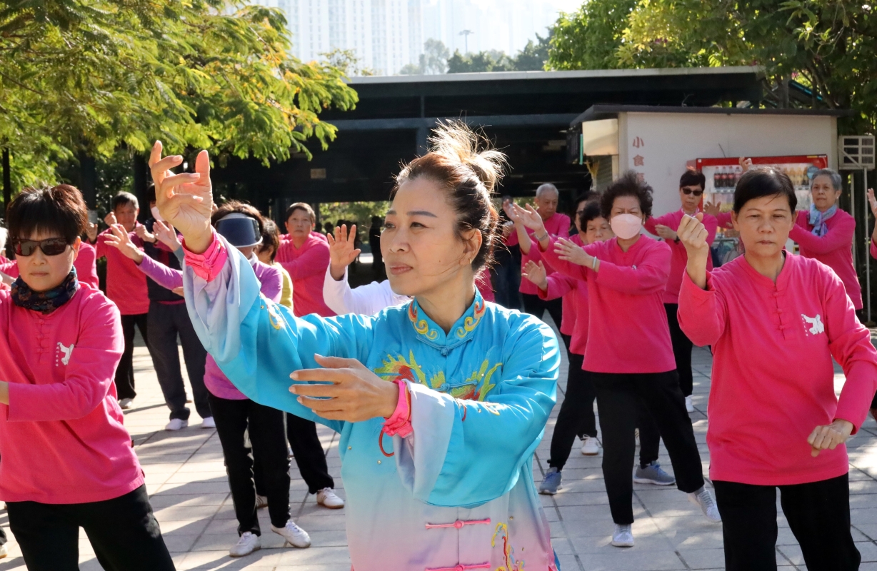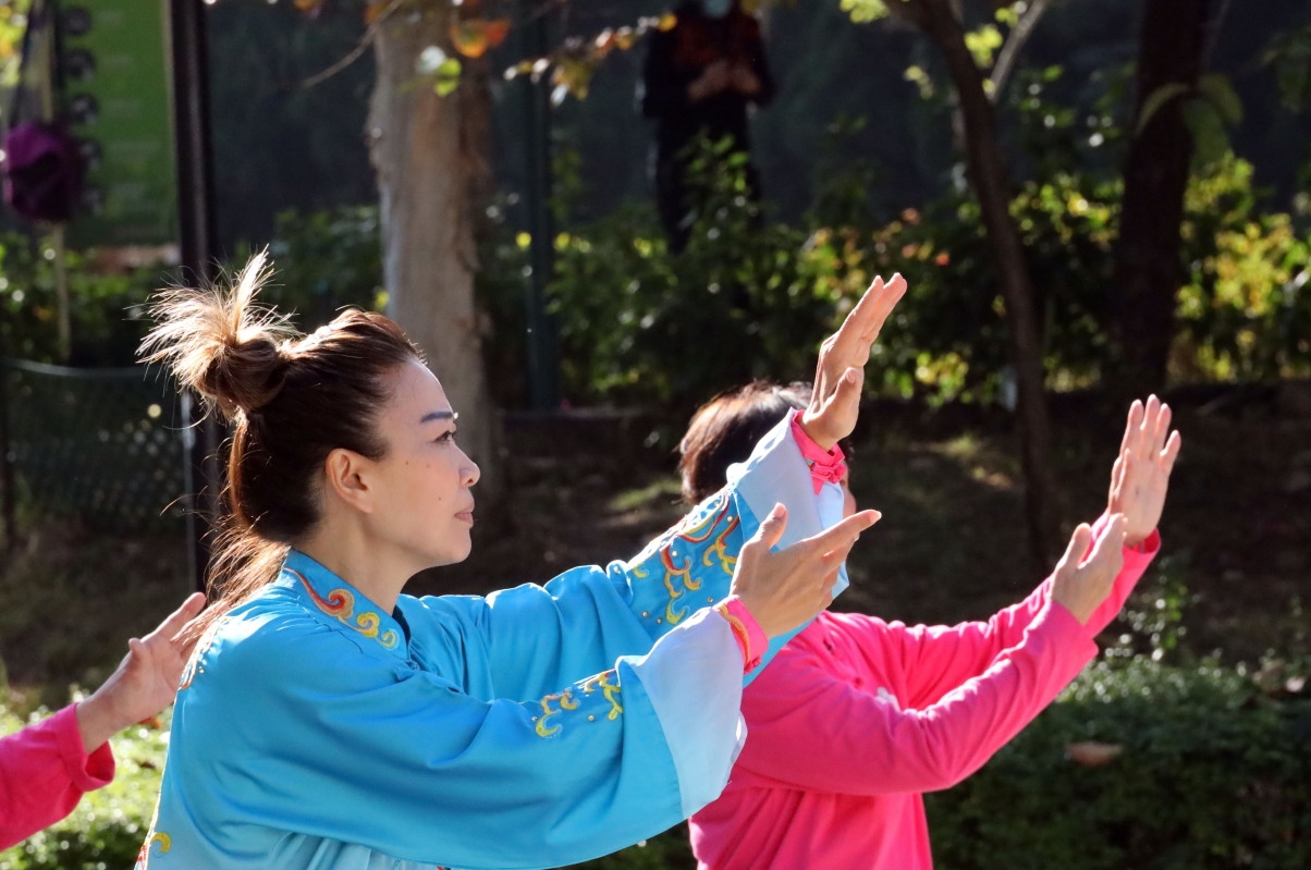 “開心太極坊”成員,正跟隨麥瑞芳師傅一招一式、環環入扣、人景合一。