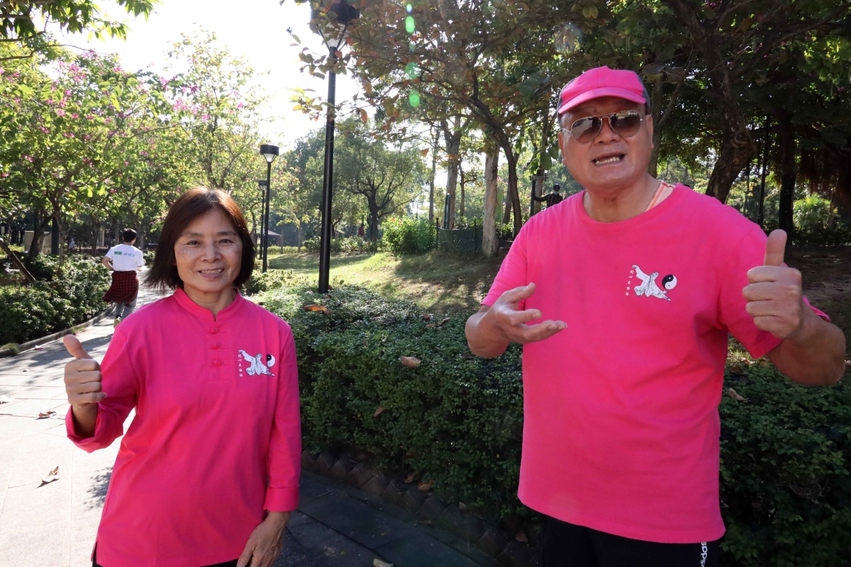 林女士(左)說,平時也會做運動,但太極拳有別於其它運動項目,對身體協調有很大幫助,而太極拳動作又可以帶來的樂趣,最重要是和一群志同道合的朋友在一起,就是“開心”兩個字。蕭先生(右)是跟隨麥師傅最久的學生之一,他說,在美孚公園跟隨麥師傅練習的街坊,從起初6人發展至如今分佈在各區的學員已經多達百餘人,學習內容非常豐富,養身功、觀音拳,八段錦,簡化太極拳,太極劍,功夫扇等。