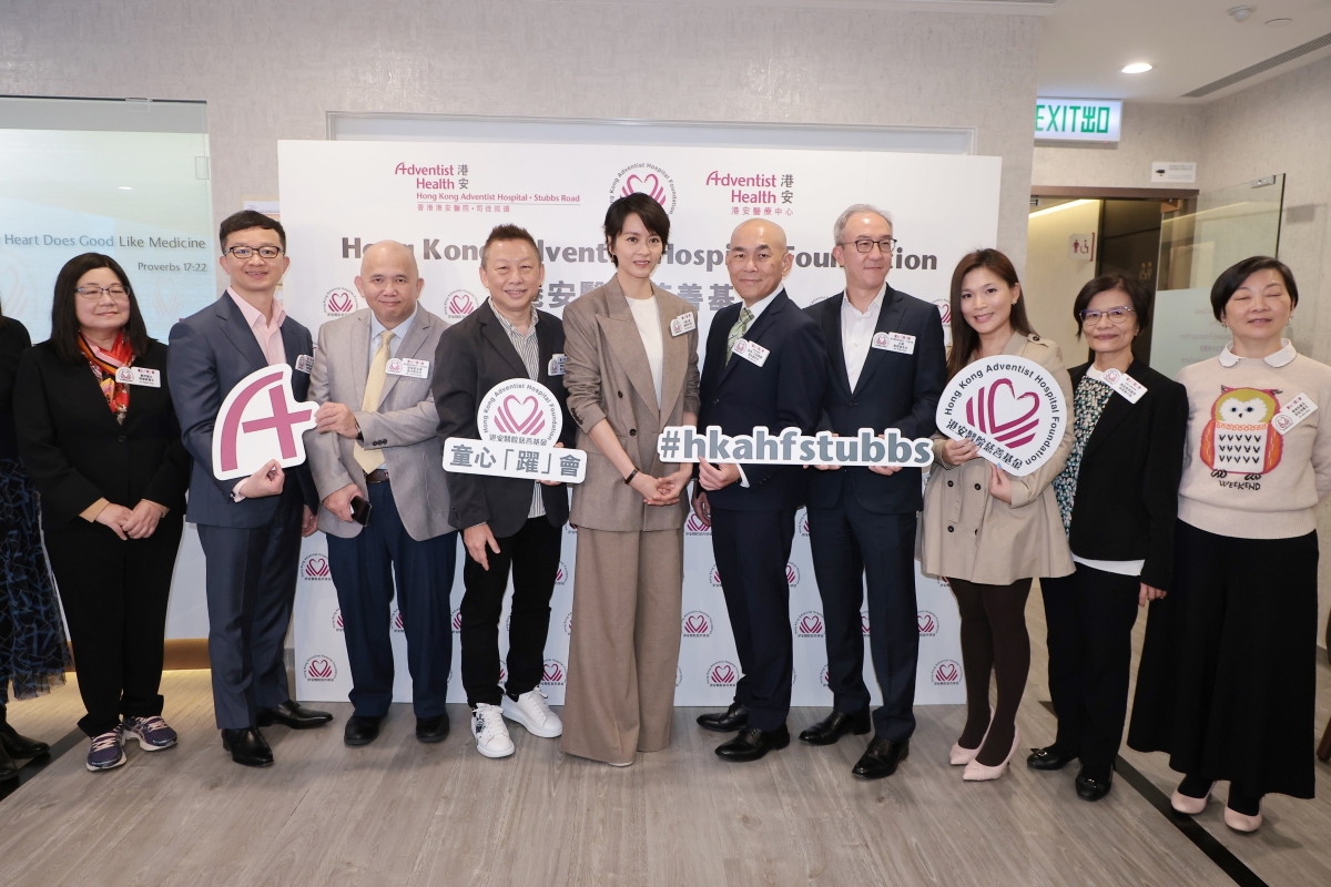 藝人梁詠琪(左五)與一眾嘉賓在鰂魚湧一大廈出席“童心躍會”港安資助計劃發布會。