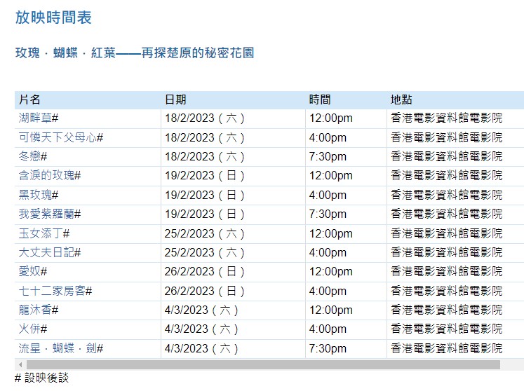 《玉女添丁》(1968)劇照(圖片:政府新聞處) 所有放映均設映後談(粵語主講,免費入場),由香港電影導演會成員,包括張婉婷、彭秀慧、關錦鵬、黃進、翁子光、舒琪、馬偉豪、鄭丹瑞、許鞍華、泰迪羅賓、王晶和畢國智擔任講者,文雋、何思穎以及喬奕思擔任主持。電影門票HK$45/張,現於城市售票網(www.urbtix.hk)發售。查詢節目詳情,請瀏覽網頁(點此)或致電+852 2739 2139。