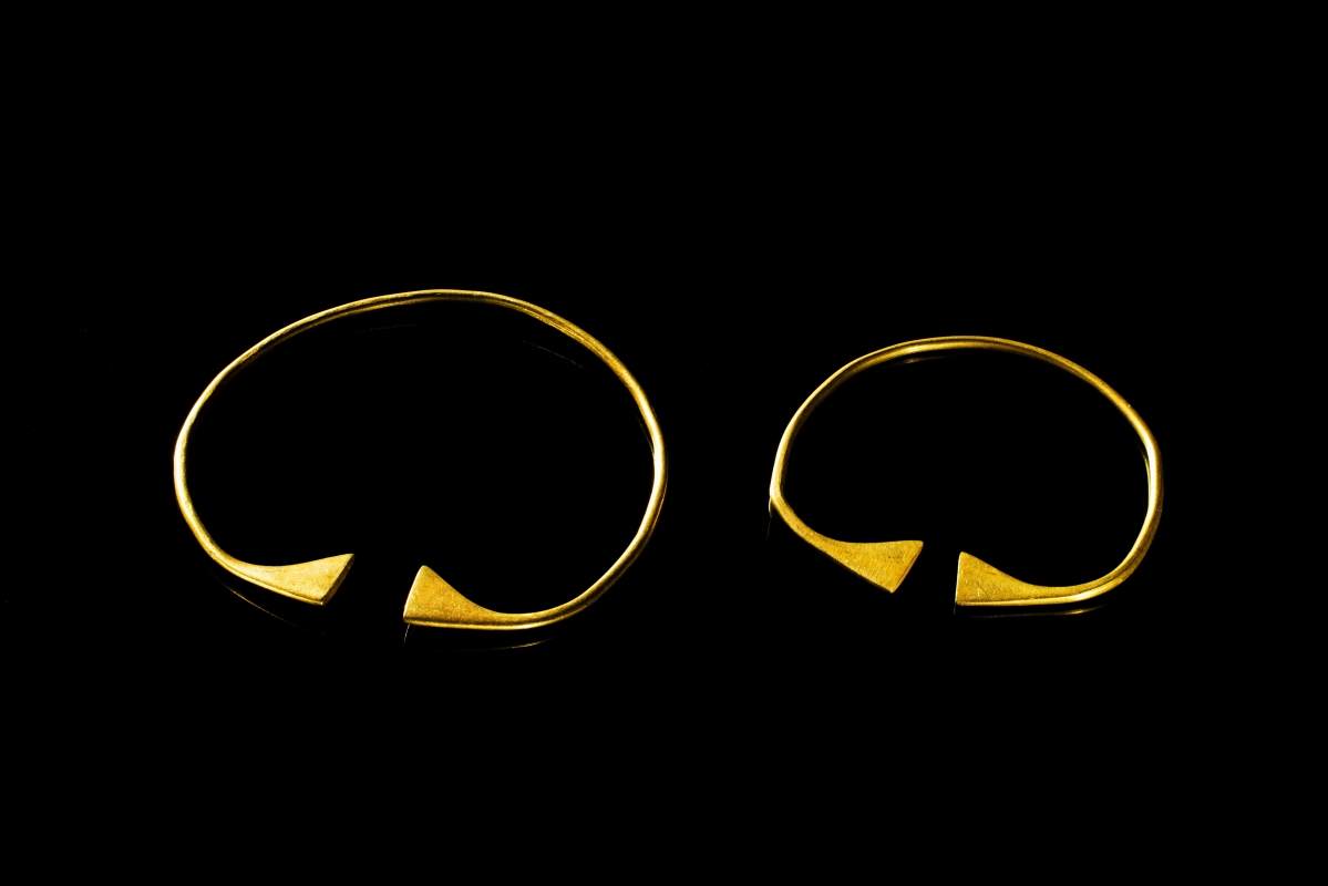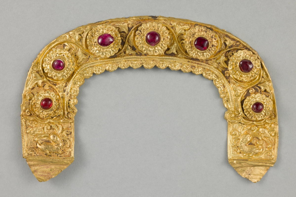 鼻飲或臂釧(圖片:香港故宮文化博物館) 展覽共分為三個部分。第一部分展示公元前18世紀中國與歐亞草原地區的早期金器,探討草原與中原地區的互動交流,展出珍品包括匈奴貴族所使用的金冠。第二部分聚焦公元7至10世紀期間唐朝與吐蕃王朝的金器,展示金器在兩個王朝密切交流中扮演的角色。展品包括吐蕃貴族所使用、帶中原紋飾的幡飾,以及唐代公主所配戴工藝上借鑑中西亞飾物的嵌寶冠飾。這些互動交流是古代絲綢之路活動的重要組成部分。展覽的第三部分呈現古代中國金器製作輝煌時期的成就,展示遼宋至明代黃金製品呈現的本土化和民族交融特色。