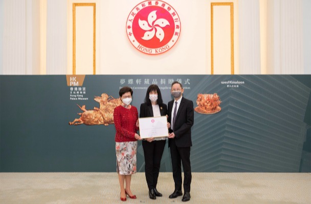 2022年盧茵茵(中)與朱偉基(右)於捐贈儀式 香港故宮文化博物館館長吳志華表示:“隨著香港重新迎接來自世界各地的旅客,我們很高興能向旅客呈獻本館的首個館藏特別展覽,展示古代中國獨特的貿易和文化交流與演變,讓觀眾了解中華民族的一體多元,誘發深層次的文化欣賞。我們非常感謝盧茵茵和朱偉基的慷慨捐贈,對博物館的發展帶來了深遠的影響。今年亦是國家倡議‘一帶一路’十周年,博物館將透過是次古代中國金飾展覽弘揚中華文化,進一步確立香港作為中外文化藝術交流樞紐的角色,讓世界各地觀眾領略多采多姿的中華文化藝術。”
