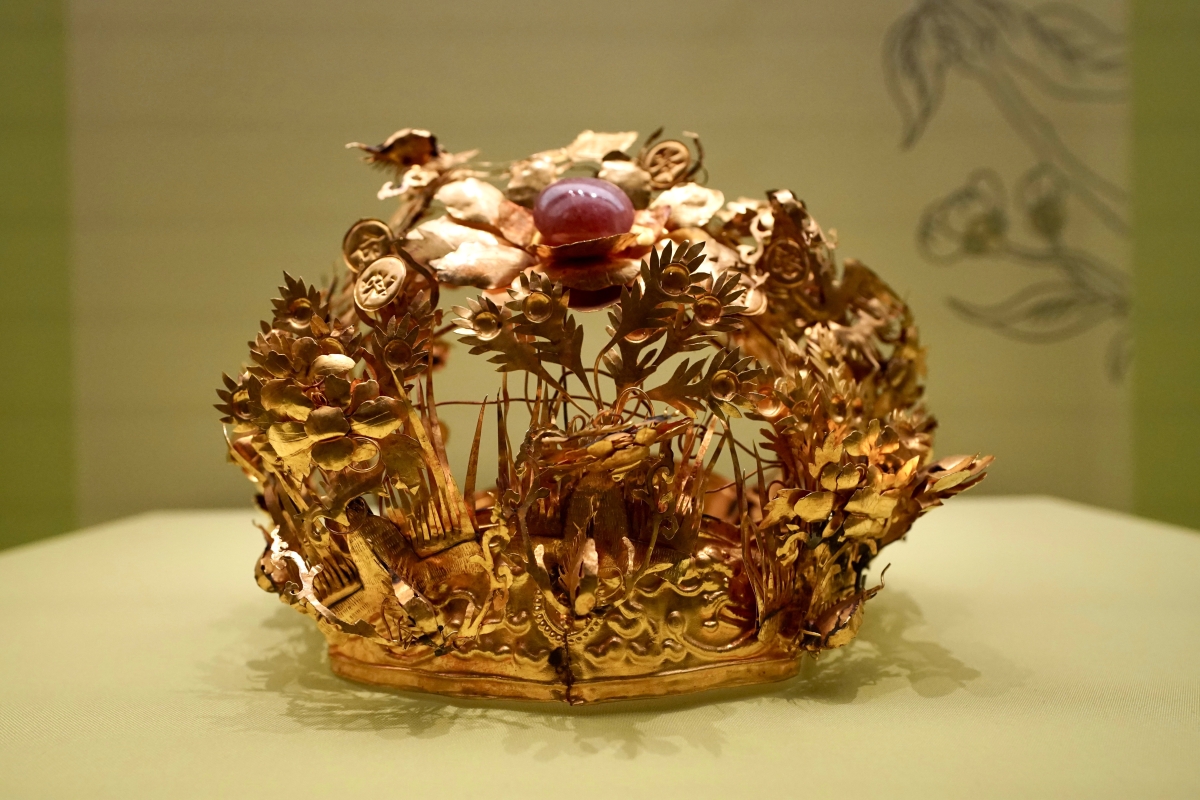 國家一級文物《金朝冠》(圖片:政府新聞處) 第二部分是透過古代女性的生活用品和飾物,讓觀眾認識古代不同階層的女性生活。國家一級文物展品《金朝冠》是清代獲頒賜封號的婦女出席隆重場合時所戴的頭飾,象徵古代女性所獲得的地位和榮耀。 第三部分雲集了歷代才女的書畫、刺繡及文房雅玩,展現出古代女性的卓越才藝。不容錯過的展品有清代閨閣畫家馬荃繪畫的立軸《花蝶圖》;以及清末刺繡大師沈壽的經典之作《美國女優倍克像》,她將西洋畫的光影透視法融入傳統蘇繡針法,高度像真地呈現人體肌膚與衣飾質感。 第四部分則是透過藝術家筆下的女性形象,讓觀眾一瞥傳奇女性的悲喜人生。精彩展品包括明代四大畫家之一的唐寅所繪的立軸《李端端落籍圖》,描繪了唐代詩人崔涯與名妓李端端的軼事。