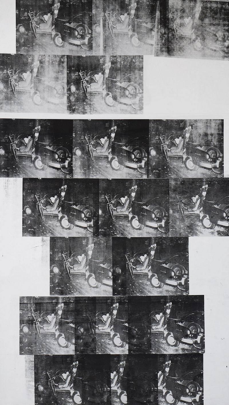 盧西安·佛洛伊德《大室內場景W11(隨華托)》 盧西安·佛洛伊德以人物畫像和裸體畫像聞名,其描繪的對象多為自己的親友。在這幅畫作中,盧西安·佛洛伊德描繪了他的大家庭:從左到右依次為他當時的愛人Celia Paul、女兒Bella、前任Suzy Boyt的兒子Kai,以及Suzy本人,躺在地板上的是畫家兒子Ali Boyt時任女友的妹妹。在構圖上,盧西安·佛洛伊德借鑒了法國18世紀畫家讓-安托萬·華托的名作《皮埃羅》。 第八位:安迪·華荷《白色災難(白色車禍19次)》 成交價:8,535.05萬美元,2022年11月蘇富比紐約