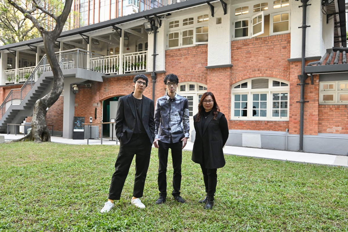 藝術推廣辦事處油街實現館長鍾婉嫻(右)與參與藝術家唐納天(左)和蔡世豪(中)合影
