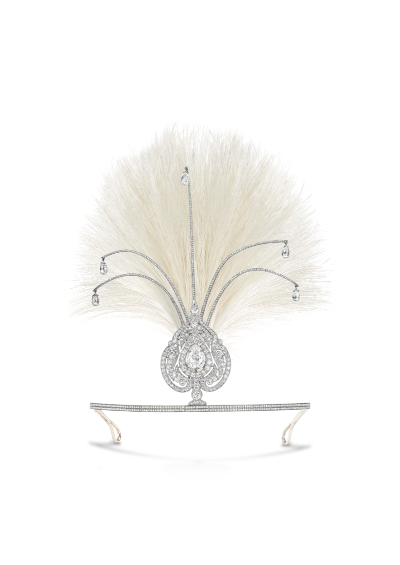 頭飾,卡地亞紐約,約1924年(圖片:香港故宮文化博物館提供) 向女性在卡地亞歷史上的角色與影響致敬 “百樣玲瓏”展透過講述歷史上多位重要女性與卡地亞之間的動人故事,追溯女性與珠寶之間的密切關係,展覽其中一大亮點為貞.杜桑(1887-1976)的故事。杜桑是現代珠寶界的革命性人物。在20世紀初仍是由男性主導的社會中,杜桑於1933年獲卡地亞第三代掌舵人路易.卡地亞(1875-1942)聘用,成為卡地亞首位女性創意總監。杜桑最具代表性的作品之一是她於1949年設計、並為溫莎公爵夫人(1896-1986)所收藏的美洲豹胸針,它改寫了珠寶對女性的意義。美洲豹象徵力量、勇氣及自主,從此成為了卡地亞的標誌性圖案。杜桑不僅透過其珠寶設計支持女性爭取權益,還鼓勵她們追求新女性的勇敢堅定和獨立自由的新態度,讓珠寶不但增強女性的外在美,還能體現女性的個性與精神。