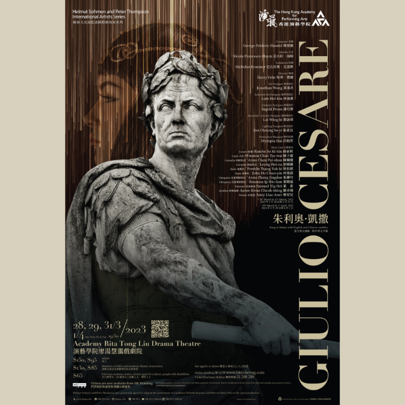 香港新聞網3月17日電 香港演藝學院音樂學院攜手舞台及製作藝術學院於本月呈獻韓德爾之經典歌劇《朱利奧.凱撒》,是次製作邀請了客席指揮尼古拉斯.克雷默(Nicholas Kraemer)與客席導演哈利.費爾(Harry Fehr)率領學生傾力演出,為觀眾獻上表演。