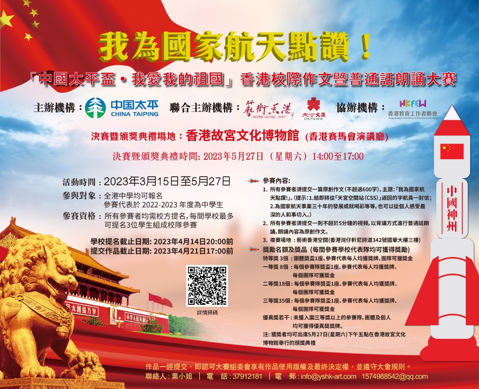 活動時間:即日起至5月27日 參與對象:全港中學均可報名。參賽代表於2022-2023年度為中學生。 參賽資格:所有參賽者均需校方提名,每間學校最多可提名3位學生組成校隊參賽。 參賽內容: 1、所有參賽者須提交一篇原創作文(不超過600字),主題:“我為國家航天點讚!”。(提示:給即將從“天宮空間站”返回的宇航員一封信;為國家航天事業三十年的發展成就喝彩等等,也可以從個人感受最深的人和事切入。) 2、所有參賽者須提交一則不超於5分鐘的視頻,以背誦方式進行普通話朗誦, 朗誦內容為原創作文。 複賽場地:藝術香港空間(香港灣仔軒尼詩道342號國華大樓三樓) 決賽暨頒獎典禮時間:5月27日(星期六) 決賽暨頒獎典禮場地:香港故宮文化博物館(香港賽馬會演講廳) 學校提名截止日期:4月14日晚上8時前 提交作品截止日期:4月21日下午5時前 更多參賽詳情可瀏覽:www.yshk-art.com/pithy-detail-2798.html 【編輯:黃璇】