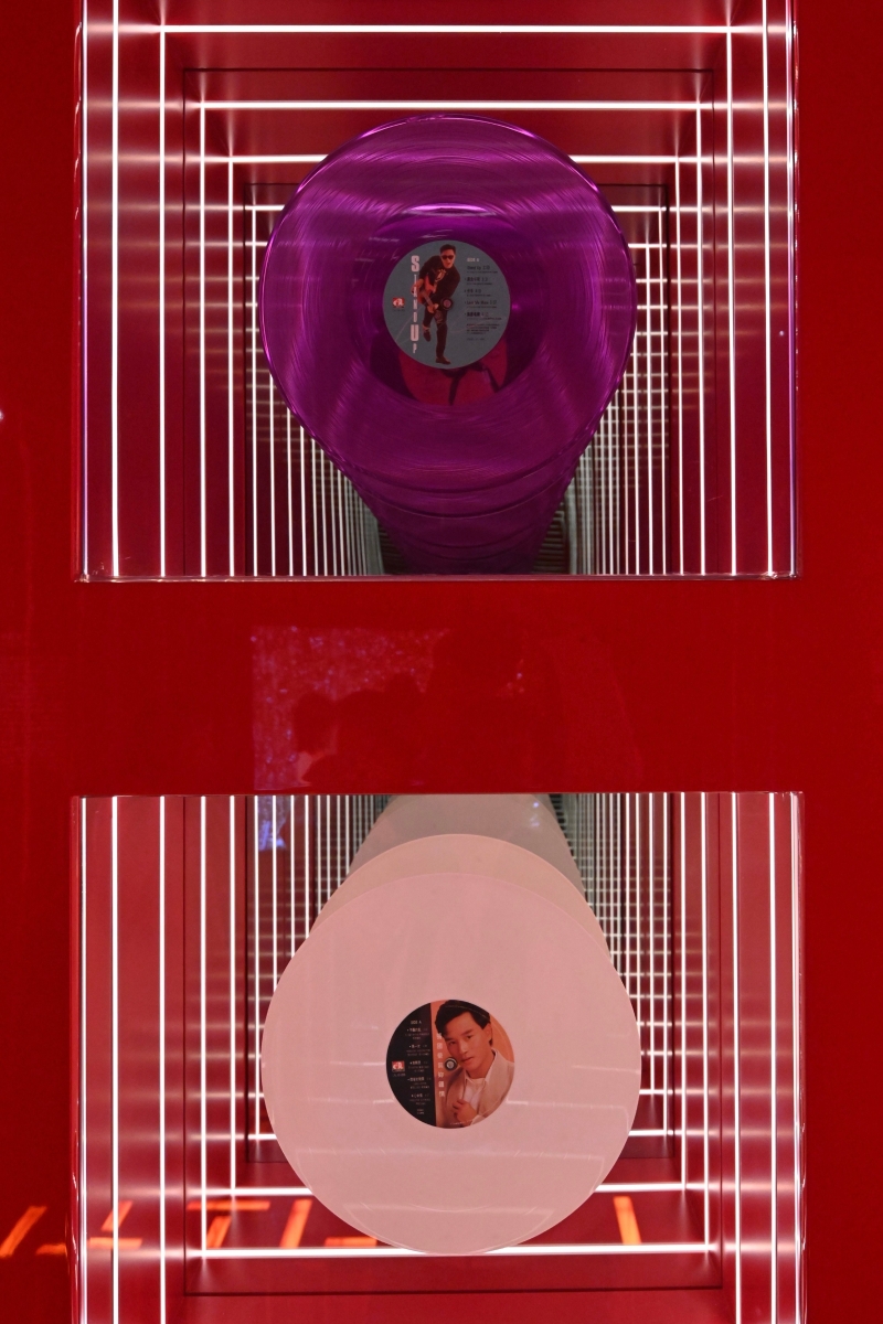 張國榮《Stand Up》黑膠唱片(紫色版)(上)及《為妳鍾情》黑膠唱片(白色版)(下)。 配合是次展覽,博物館大堂亦會設有專題展示,與公眾分享從香港中央圖書館館藏中精選的張國榮黑膠碟及鐳射唱片,展期至4月中旬。