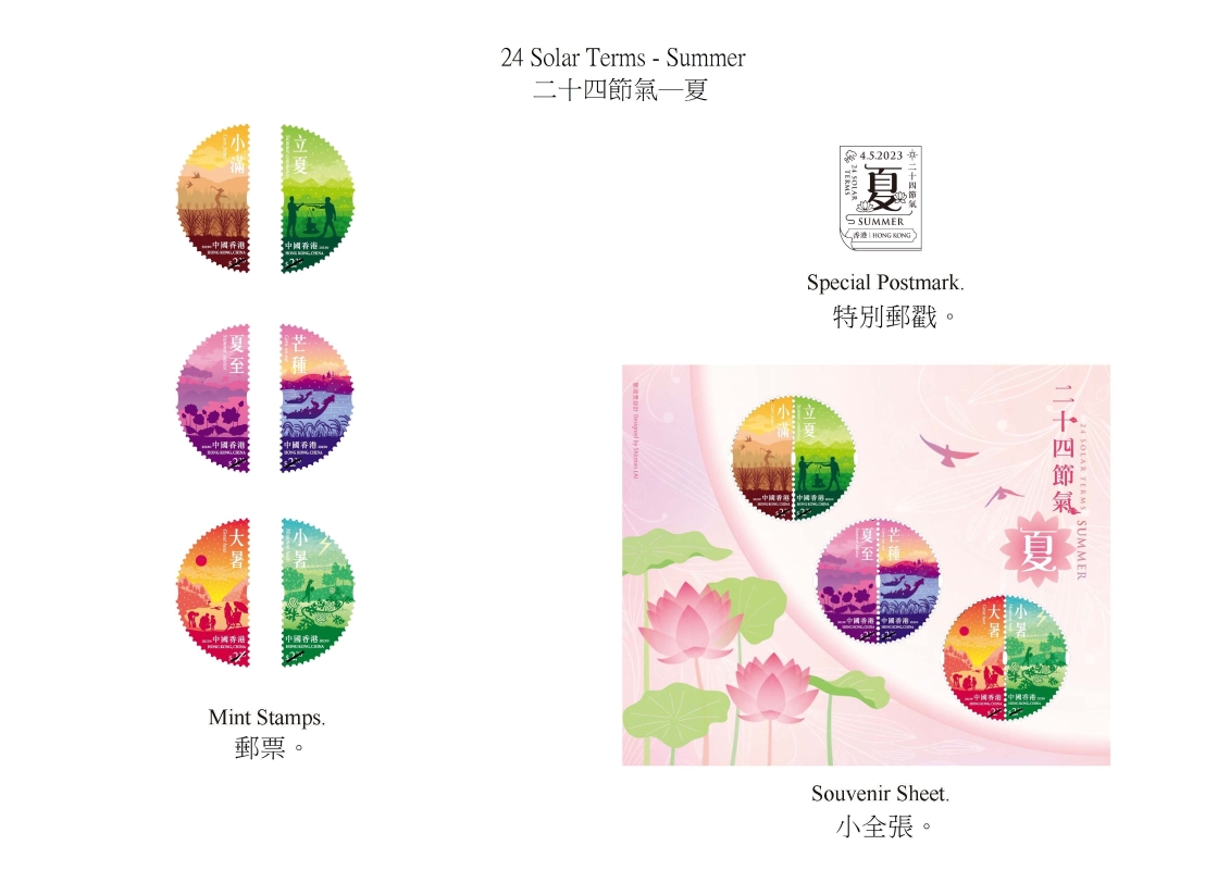 圖為郵票、小全張和特別郵戳。 繼2020年發行以“二十四節氣——春”為題的特別郵票,香港郵政續以“二十四節氣——夏”為題發行一套六枚郵票、一張小全張及相關集郵品,以繽紛的色彩介紹夏季六個節氣,分別為立夏、小滿、芒種、夏至、小暑及大暑,延續“二十四節氣”郵票系列。