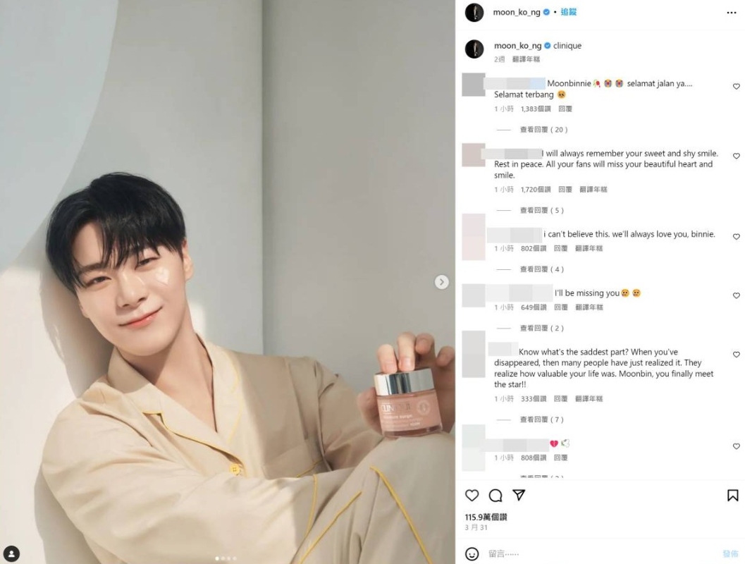 文彬最後一個IG帖文無異樣。 文彬昨晚(19日)約8時10分被經紀人發現在家中離世。有韓國網友更發現文彬的名字出現在首爾峨山醫院的太平間,而出殯日期是後天22日,正是原定要在澳門開演唱會的日期。而粉絲們得知文彬身亡的消息,更湧入其IG留言。看到他的IG亦沒有異樣,最後一個帖在3月31日上載,是為一個品牌宣傳的帖子。
