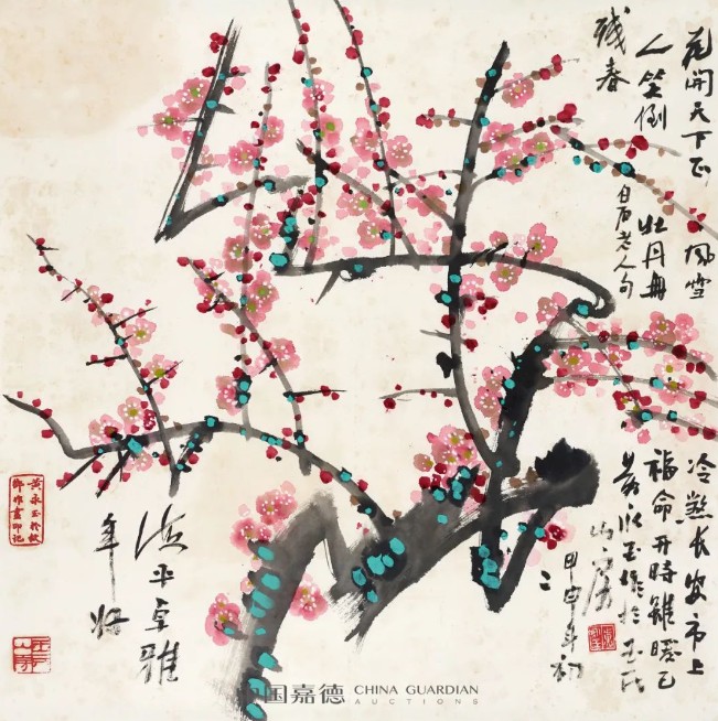 黃永玉《花開天下》。(圖片:中國嘉德) 十幾歲便走出家鄉鳳凰,遊歷南北、飽經世事,鍛造了他的百歲傳奇人生。豐厚的經歷滋潤了其藝術創作:兒時常於荷塘邊嬉戲,造就了黃老筆下荷色的生機勃發、風姿飄逸;傲骨的梅花,常見其筆下,梅枝蒼勁、姿態風骨盡現。小動物的塑造,又顯現其不老童心:憨態可掬的小兔子、各唱各的小鳥,都似乎置身童話世界之中。 黃老筆底漫妙,譏諷不平世事。常直抒胸臆,在悠然畫間直指人心。 【編輯:黃璇】
