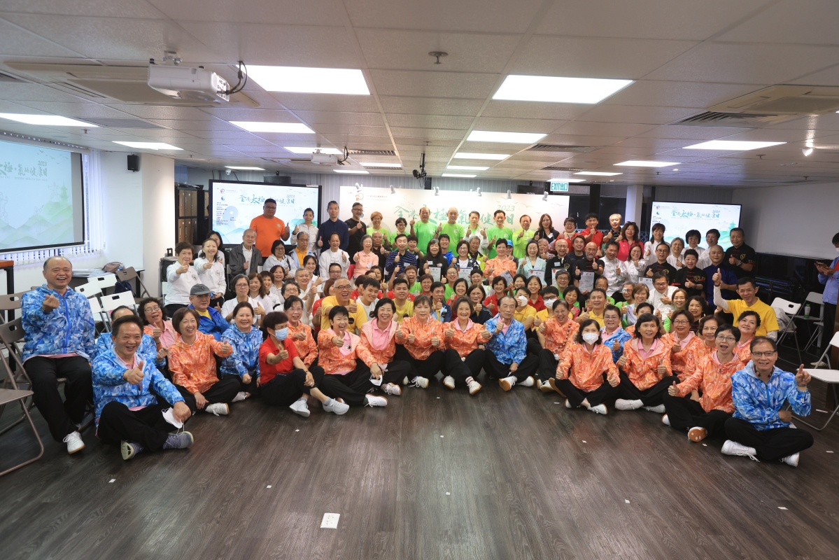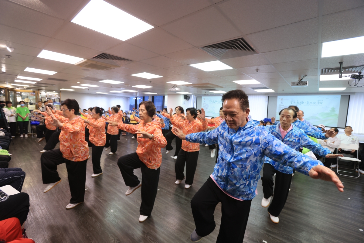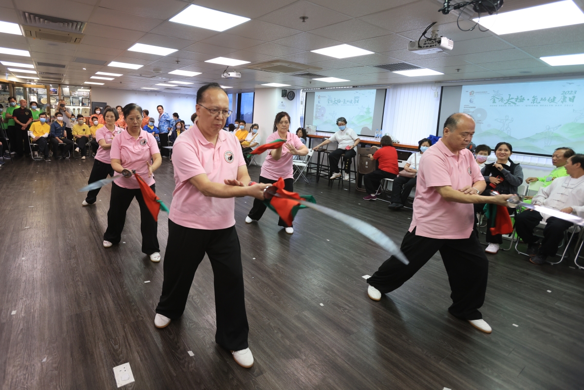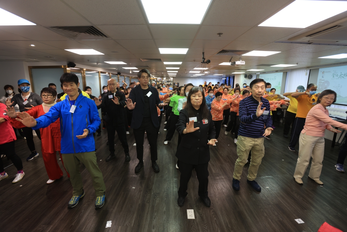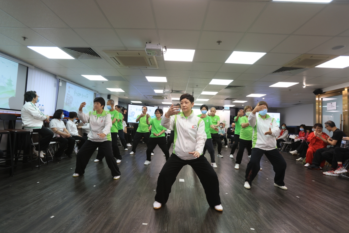 自然健身氣功會榮譽創會主席陸慧心(右三)與眾人在現場演練,響應《2023全港太極氣功健康日》活動