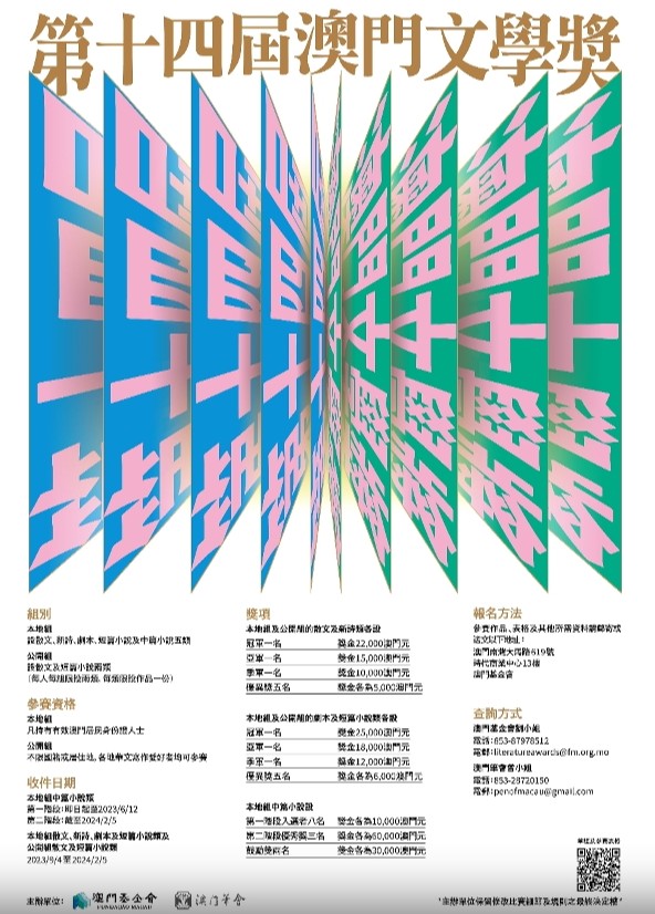 香港新聞網6月5日電 由澳門基金會及澳門筆會聯合主辦的第十四屆“澳門文學獎”分本地組及公開組兩組,本地組設散文、新詩、劇本、短篇小說及中篇小說五類,公開組設散文及短篇小說兩類,每人每組限投兩類,每類限投作品一份。當中,本地組中篇小說第一階段現正接受投稿,截稿日期為2023年6月12日;其他類別將於2023年9月4日開始接受報名。