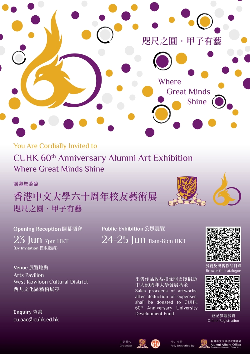 這場不容錯過的藝術展覽陣容鼎盛,將呈獻逾60位本地及國際校友藝術家及老師之創作,包括但不限於水墨、書法、雕塑、油畫等,當中更會展出國學泰斗饒宗頤教授及丁衍庸教授之作品,還有近年炙手可熱的藝術家黃進曦、周俊輝、張子軒、劉彥韜、張小黎等一眾校友,展示中大人於藝術界的無限潛力。