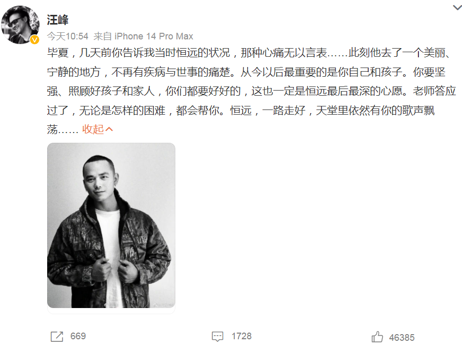 《中國好聲音》第二季亞軍張恆遠因病去世,汪峰發文悼念分享到: