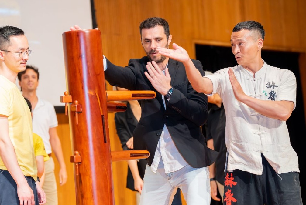 詠春表演。(圖片:澳門大學) 結業典禮以氣勢磅礴的中國樂曲合奏拉開帷幕。學員們還利用課餘時間精心準備了中文節目《三句半》,風趣幽默、押韻靈巧;小品《學中文的故事》將有趣的劇情與漢語詞彙相結合,講述一個個有意思的故事。台下觀眾掌聲雷動,笑聲不斷,讚歎“中文真有意思!”。此外,學員跟隨澳門拳藝俱樂部體驗了抱拳禮、木人樁法、日字沖拳、問手等招式,不僅學習了防身之術,也認識了中國傳統文化。隨著學員們集體合唱《孔院祝福歌》,典禮在歡快的歌聲中落下帷幕。 澳大孔子學院的漢語課程設初級I、II,中級I、II、中高級和高級六個等級,內容與實際生活緊密結合,助學生掌握最實用的漢語表達。學院還提供文化小課堂、線上漢字課程、文化活動等,讓學生在輕鬆愉快的氛圍中感受中華文化的魅力。 【編輯:黃璇】
