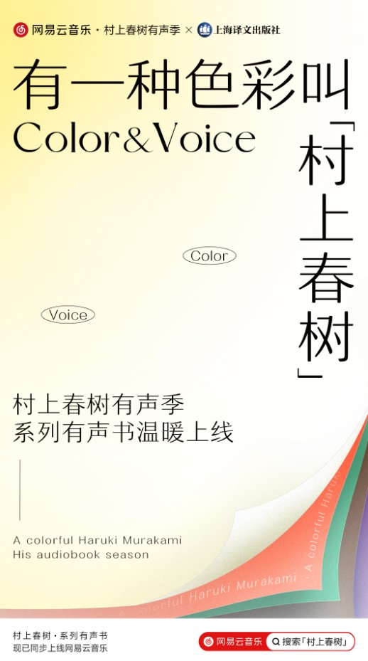 香港新聞網6月26日電 近日,網易雲音樂聯手上海譯文出版社,打造“網易雲音樂村上春樹有聲季”,攜手9位文化大咖重磅發布村上春樹色譜和系列有聲書,9 種村上春樹色與其代表作一一對應,配有專屬有聲音頻,帶領聽眾在聲音與色彩裡遇見百分之百的村上春樹。