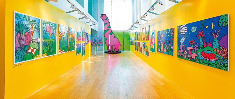 香港新聞網6月27日電 生於香港的插畫藝術家Ton Mak,以其最具代表性的“FLABJACKS”系列角色而為人熟知,她習慣以簡單的線條勾畫童心未泯的感覺,最近她的作品來到海港城美術館——Flabjacks “WELCOME HOME”近日起展出29幅充滿童趣且色彩繽紛的壓克力(Acrylic)畫作,更有“恐龍”和“老虎”兩個新角色的首次亮相,現場還有一隻4米高的粉紅恐龍木雕帶着微笑向窗外望去,充滿童趣。
