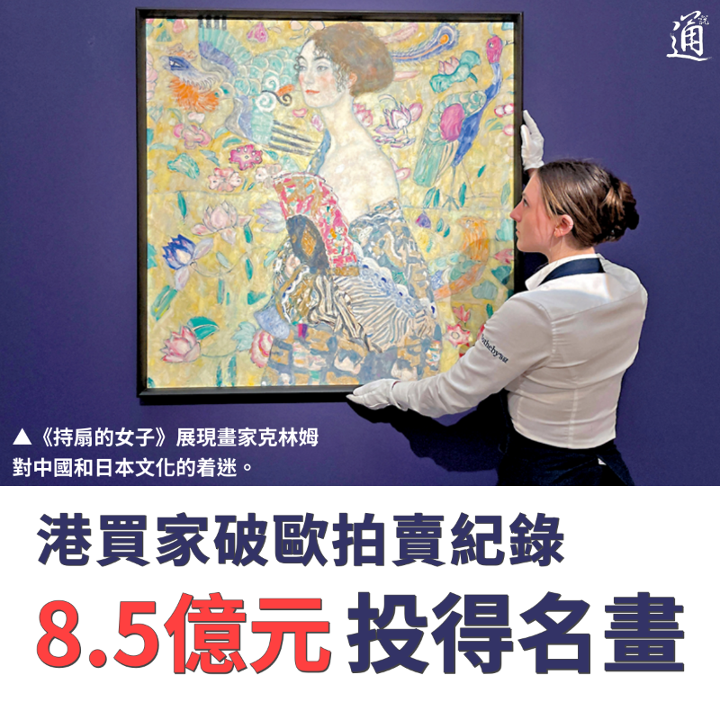 香港新聞網6月29日電 倫敦蘇富比拍賣行近日舉行現當代藝術晚間拍賣會,奧地利國寶級畫家克林姆(Gustav Klimt)的遺作《持扇的女子》(Dame mit Fächer),以8,530萬英鎊(約8.55億港元)成交,不僅打破莫奈《睡蓮》2008年在倫敦佳士得拍賣會的4,090萬英鎊(約4億港元)成交紀錄,也創下史上歐洲拍賣會畫作成交價的最高紀錄。