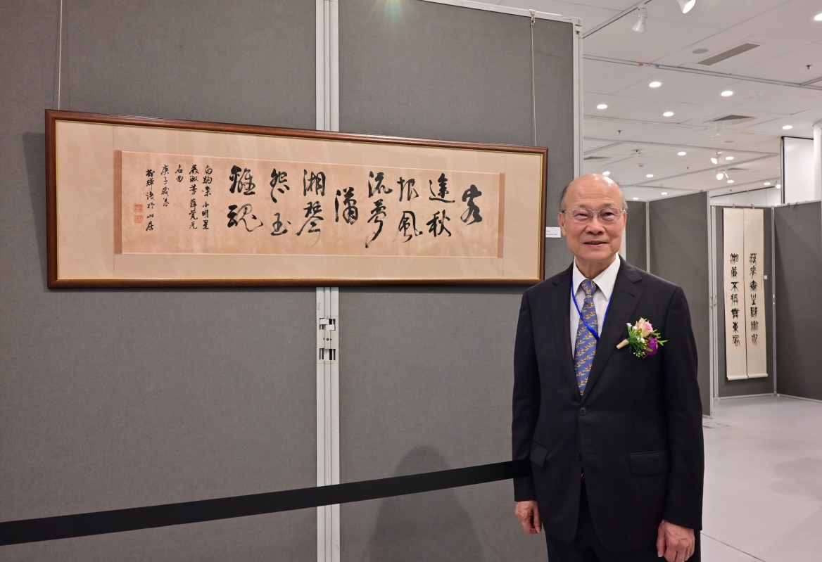 甲子書學會會長蘇樹輝攝於其作品前。(主辦方供圖) 立法會議員馬逢國在展覽開幕禮上致辭時表示:“展覽讓更多人接觸書法藝術,感受中國思想文化,引導市民欣賞嶺南文化,展現博大精深的文化底蘊。寄望香港各界繼續推動書法發展,通過美術的視覺形式,說好香港故事和中國故事。”