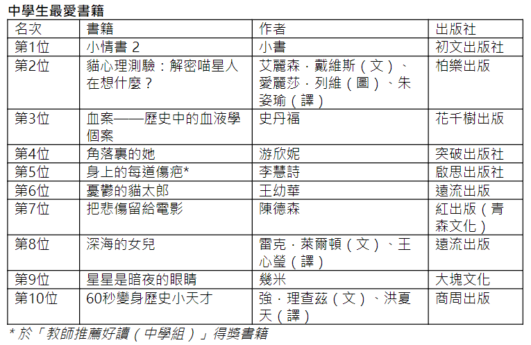 教師推薦好讀(小學組)列表。 文學類書籍及名人傳記受師生歡迎 “中學生最愛作家”由已故香港科幻作家作家倪匡(筆名衛斯理)奪得,他的《衛斯理系列少年版25大廈(上)》同時入圍教師推薦好讀(中學組)第5位。衛斯理的作品組織嚴謹又帶啟發性,常使人有意想不到的收穫。其中《衛斯理系列》涉獵天文、物理、生物、考古、地理、化學等知識,燃點幾代年輕讀者閱讀科幻小說的熱情。 中學組以文學類書籍較受師生歡迎,如《小情書2》、《角落裏的她 》分別榮登中學生最愛書籍第一位和第四位。除此之外,多位本地名人傳記,包括奧運金牌得主張家朗的《劍擊成就了我——奧運冠軍張家朗》、“女車神”李慧詩的《身上的每道傷疤》、金像獎導演陳德森陳德森的《把悲傷留給電影》在教師推薦書籍榜上有名,反映港人對體育和電影的熱愛有增無減。