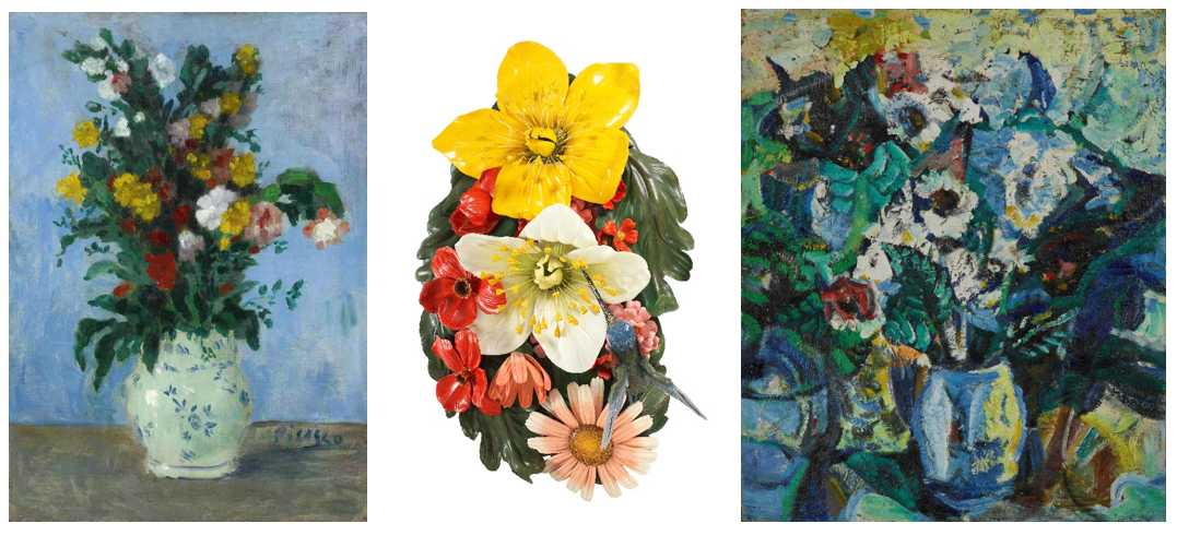 左起:巴勃羅·畢加索《瓶花》,1901年,布面油畫; 傑夫·昆斯《牆面浮雕與鳥》,1991年,木雕彩繪;吳大羽《瓶花》,約1950年,布面油畫。 “花花世界”現當代藝術典藏系列基於德基藝術博物館近十年的系統性收藏,以中國及國際現當代藝術中的花卉靜物作品為主體。“動靜無盡:花卉靜物三百年”作為“花花世界”現當代藝術典藏系列的首回展覽,由紐約市立大學亨特學院榮休教授、曾任紐約現代藝術博物館(MoMA)策展人的喬金·畢沙羅(Joachim Pissarro)策展。參展藝術家涵括莫奈、畢沙羅、塞尚、高更、畢加索、蒙德里安、莫蘭迪、馬格里特、喬治婭·歐姬芙等西方現代藝術各流派的里程碑式人物,常玉、潘玉良、吳大羽、吳冠中、趙無極、朱德群等中國第一、二代留洋藝術先驅,黎譜等亞洲其他國家的現代藝術開拓者,以及安迪·沃霍爾、草間彌生、大衛·霍克尼、傑夫·昆斯、奈良美智、村上隆、達明安·赫斯特等當代藝術家。 本次展覽首創性地對花卉靜物體裁的定義進行深度重新評估,主張“靜物”遠不止是描繪靜止之物。作品中的花卉看似靜止不動,花朵們卻無時無刻不在以肉眼難以覺察的頻率保持運動。展覽以花卉的生長、繁衍、雜交和流通之“動”為靈感,通過“異花授粉”、“先鋒園藝”、“花卉之外”、“突圍綻放”四個章節,展開深入花卉靜物中“靜”與“動”之辯證關係的四個全新維度:在時空維度,數百年來花卉品種的全球流通與藝術的跨文化交流相伴;在物種維度,人類與花卉培育關係的變遷同藝術創作並行;在象徵維度,藝術中的花卉蘊藉著超越現實表象的寓意和寄託;在變革維度,花卉靜物始終作為藝術家試煉技藝、求索無限革新可能的載體。