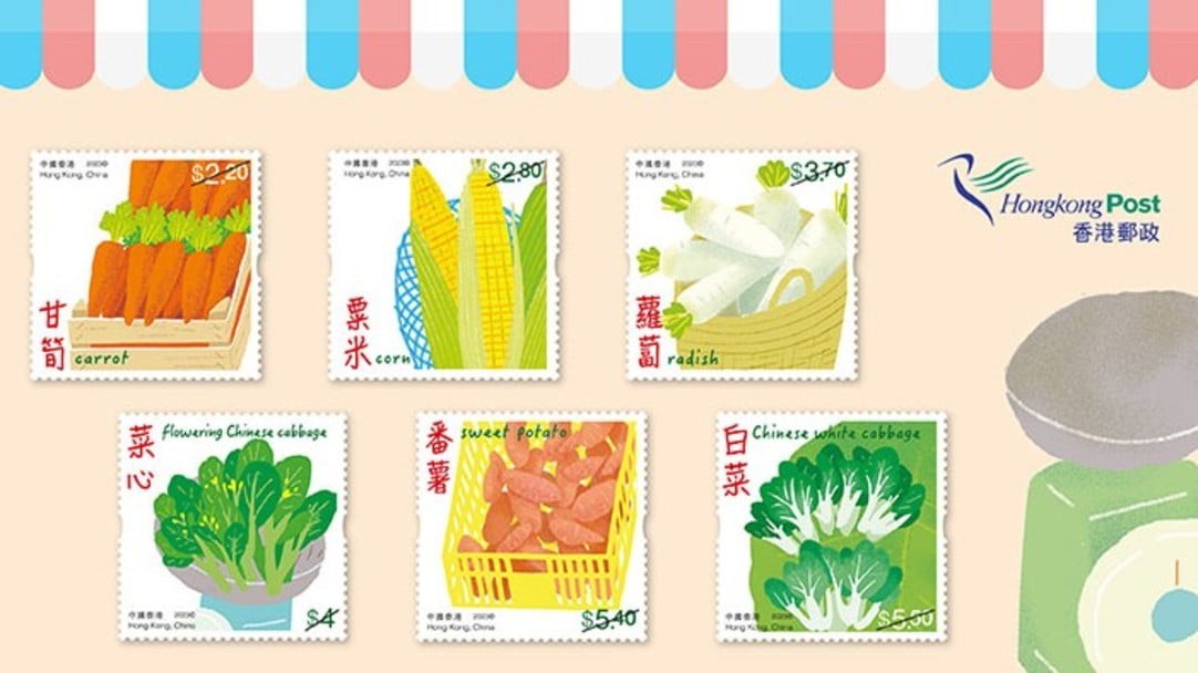 圖為“香港蔬菜”郵票、郵票小型張和特別郵戳。 香港郵政以“香港蔬菜”為題發行一套六枚郵票、一張郵票小型張及相關集郵品。設計師以繪畫形式展示本地種植的蔬菜,配搭不同的盛載器皿,色彩繽紛悅目,把新鮮的蔬菜生動地呈現眼前。
