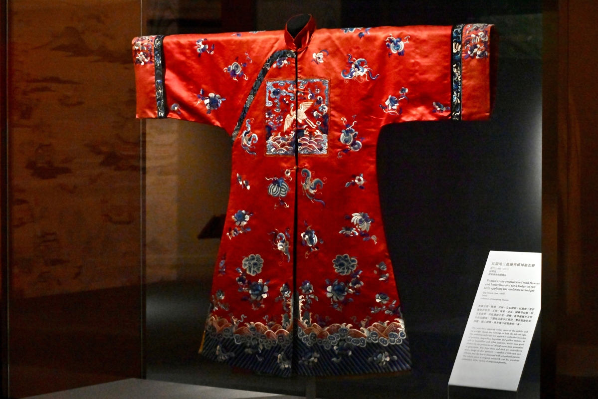 清代紅緞地三藍繡花蝶補服女褂,為國家三級文物。(廣東省博物館藏品)