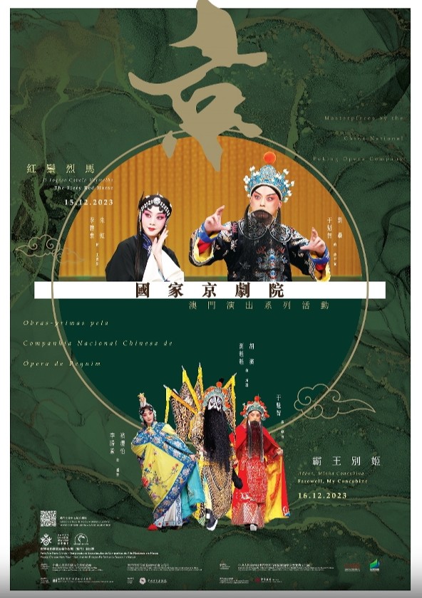 國家京劇院澳門之行,由于魁智及李勝素兩位著名京劇表演藝術家率領最強陣容來澳,上演兩齣京劇經典大戲。12月15日以傳統劇目《紅鬃烈馬》開幕,該劇講述薛平貴與王寶釧的愛情故事,夫妻二人失散18年相認,薛平貴得代戰公主之助,攻破長安,自立為帝;12月16日上演的《霸王別姬》是京劇大師梅蘭芳編創的梅派青衣經典劇目,故事講述楚漢相爭末期,西楚霸王項羽中了韓信十面埋伏之計被圍困,漢營隨後使出四面楚歌之計,楚軍倍感思鄉,軍心渙散、四處逃亡,隨項羽征戰多年的虞姬深知情勢不妙,立拼一死以斷情絲,而項羽因戰敗,無面目見江東父老,於烏江自刎。這次國家京劇院來澳門演出,將讓澳門市民品味到精彩紛呈、震撼人心的國粹盛宴。