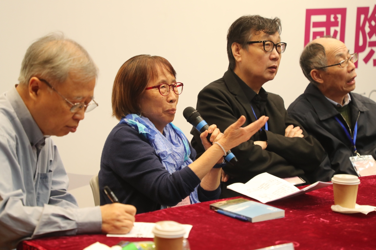 中國內地著名作家蘇童(左起)、中國作家協會書記處書記、《人民文學》雜誌社主編施戰軍、廣東省作家協會主席蔣述卓教授、復旦大學國家哲學社會科學領域一級教授、著名評論家陳思和、韓國外國語大學榮譽教授朴宰雨