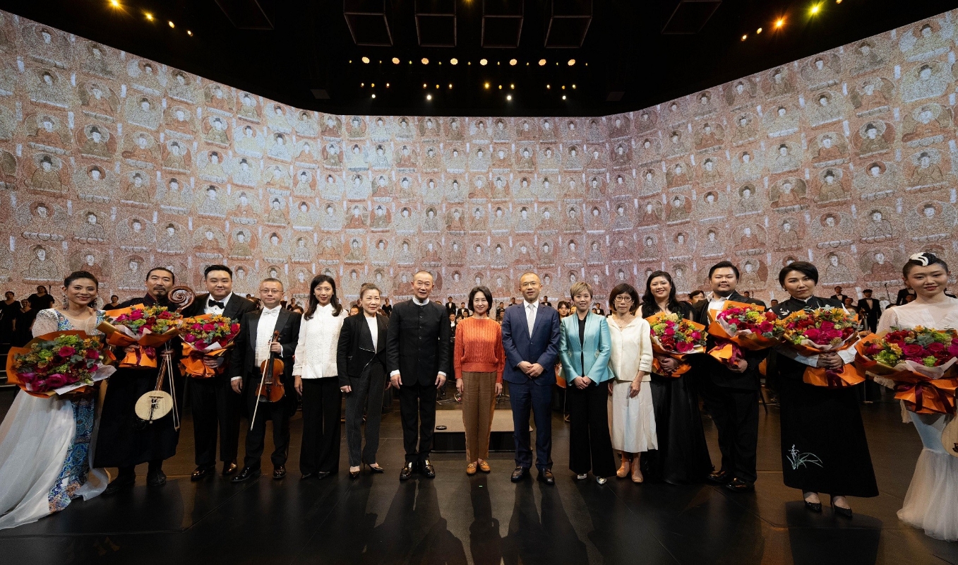 美高梅中國控股有限公司董事長及執行董事何超瓊(中)、《敦煌‧慈悲頌》作曲家兼指揮家譚盾(左七)與主要演出人員合影。(圖片:美高梅提供)