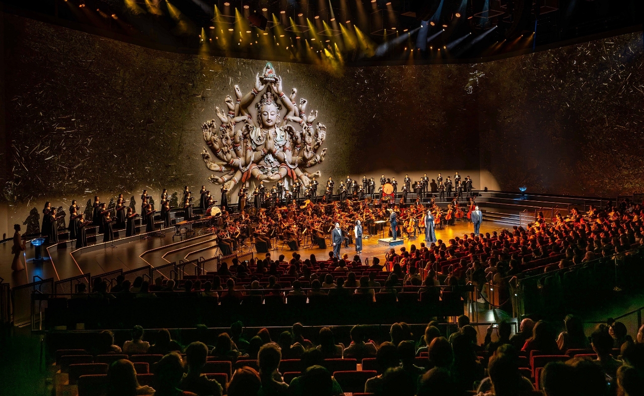 《敦煌‧慈悲頌》第三幕〈千手千眼〉。(圖片:美高梅提供) 《敦煌‧慈悲頌》是譚盾往返敦煌數十次、耗時6年創作。創作靈感來自敦煌石窟壁畫,全曲分〈菩提樹下〉、〈九色鹿〉、〈千手千眼〉、〈禪園〉、〈心經〉及〈涅槃〉六幕,包羅萬象。多位歌唱家與合唱團、管弦樂隊密切配合,共同呈現絲綢之路上的故事與智慧,同時亦結合了呼麥、原生態女高音、敦煌樂舞、多媒體等多種元素,融匯中西歌劇,採用中文和梵文演唱敦煌壁畫中記載的東方哲學,並對壁畫裡的古樂進行還原,充分體現中華絲路文化博採眾長的特質,展現恢弘的人文與藝術視野。
