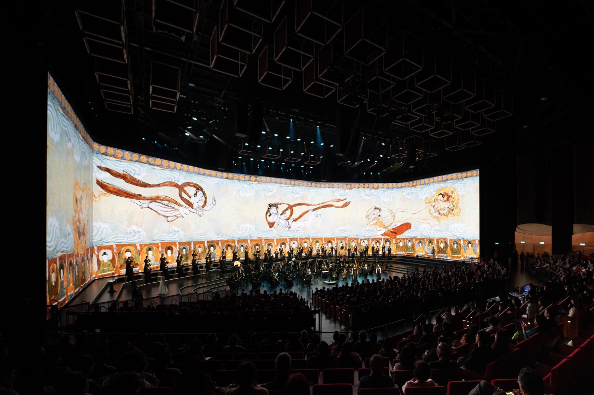 此次在澳門首度嘗試以數碼化呈現經典敦煌壁畫。(圖片:美高梅提供) 今次是《敦煌‧慈悲頌》在澳門的首次公演,譚盾親自指揮,邀請一眾敦煌古樂演奏者和國際歌唱家同台演出,包括著名男低音楊熠、女中音劉倪汝、男高音顏嘉樂、著名女高音鐘嘉欣、藏族原生態女高音擁江帆、原生態呼麥男低音與敦煌古代奚琴演奏者哈斯巴根,及敦煌反彈琵琶舞者陳奕寧等。