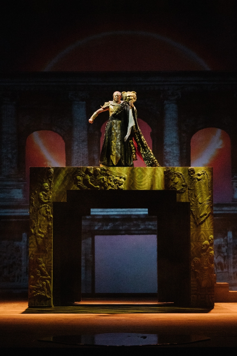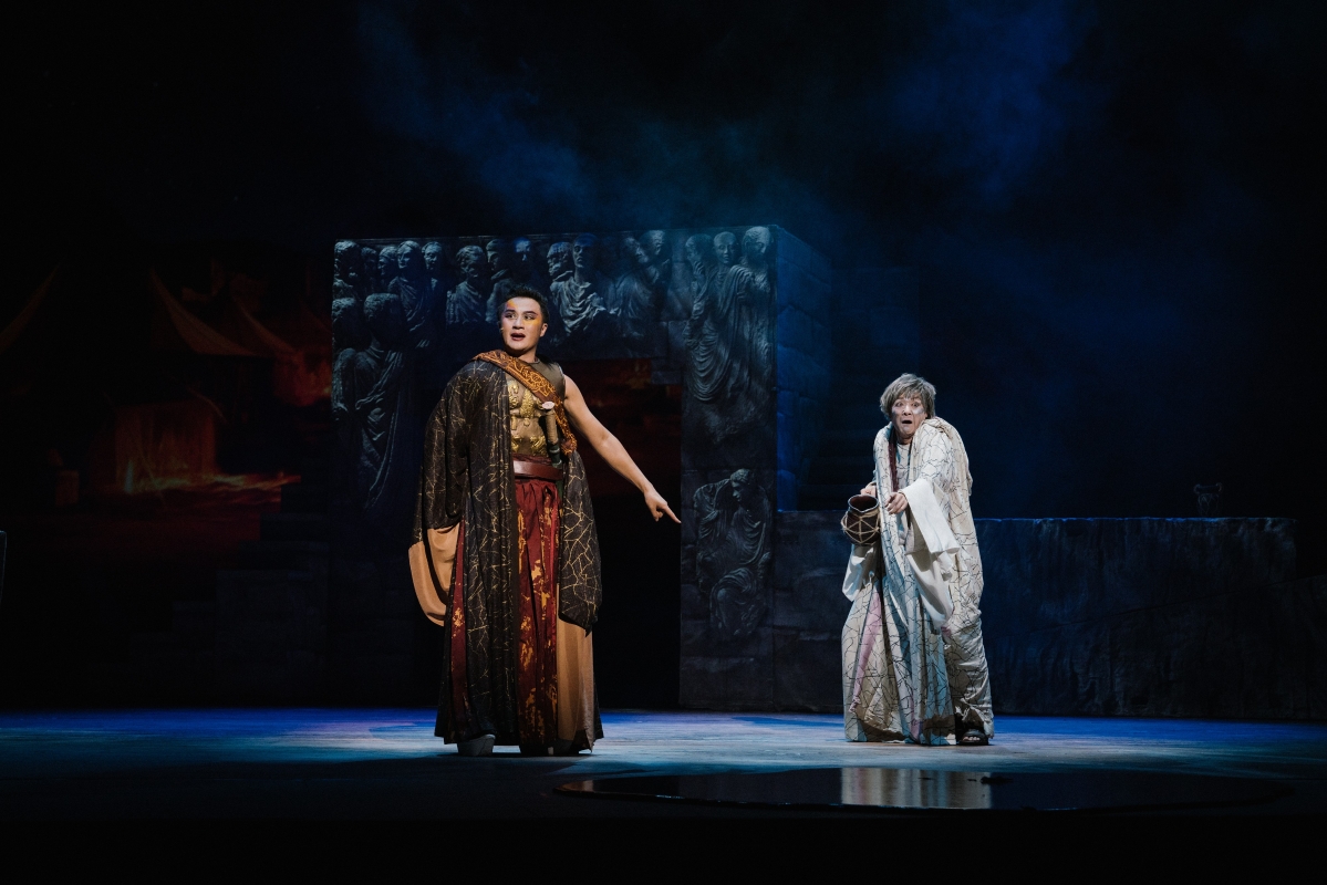 吳興國飾演凱撒。(香港藝術節提供,攝影:Ray Leung) 今次是京劇大師及著名演員吳興國帶領其創辦的“當代傳奇劇場”第四度踏上香港藝術節舞台,吳興國一直在尋找京劇在當代舞台的未來;無獨有偶,有“崑曲王子”之稱的張軍也是同路人,兩人首度合作,改編莎士比亞歷史名劇《凱撒大帝》,融合京劇與崑曲演繹古羅馬的政治風雲,又藉由科技與劇場的融合,讓觀眾恍如“穿梭古今”。 昨晚首演現場,上座率達九成,演出前不少觀眾都細心閱讀節目場刊。演出時長1小時40分鐘,這部環繞國家、權利和慾望、友誼的作品,音樂激昂、劇情緊湊,高潮迭起。節目不設中場休息,一氣呵成,也令整齣戲更扣人心弦。