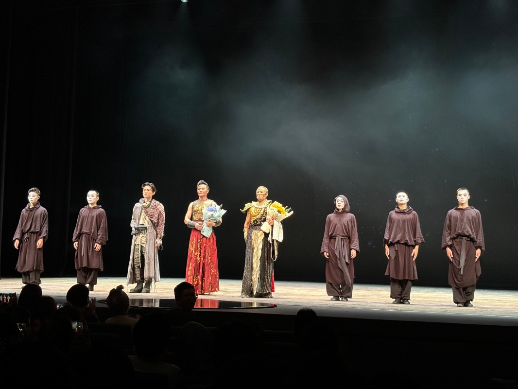 演出謝幕,觀眾報以熱烈的掌聲。(香港中通社記者 黃璇攝) 改編自莎士比亞悲劇劇本的《凱撒》,講述凱撒大帝被眾元老背叛刺殺。全劇分九個篇章,劇中凱撒並非主角,在第五章經已身亡,一般認為背叛凱撒的元老卜拓思(Brutus)才是真正主角,表現他的內心掙扎。《凱撒》是張軍和吳興國的雙人戲,兩人不斷轉換角色,時而是討論刺殺凱撒的元老卜拓思和賈修司(Cassius),時而是預言死亡的預言者和凱撒。 演出結束後,有陪同父母前來觀賞演出的年輕人表示,自己不大了解劇情,看完整場演出發現兩位主角分飾多角,“凱撒、賈修司、安東尼是同一個人演的,實在太厲害了!他(張軍)的戲劇表現力和唱腔都很厲害。”有喜愛傳統戲曲的觀眾表示這樣的創新融合“有驚喜”,對壓軸戲印象深刻,也有吳興國的粉絲專程從佛山前來看首演,表示“非常精彩,不虛此行”。 《凱撒》本應於2020年在香港藝術節首演,但受疫情影響,歷經波折下終於在今年上演。當代傳奇劇場表示,“在這漫長艱困的疫情中,兩位老師雖然不能再飛,但還是透過視訊的方式排練。終於在今天,《凱撒大帝》得以以全新的姿態和大家見面,那些在倉庫躺了5年、由張忘老師設計的雕像布景現在正在舞台上築出古羅馬的歷史輝煌,由賴宣吾老師設計的服裝,終於穿在了張軍老師的身上。”有觀眾留言稱,“當年買了票,等了四年,終於等到了,星期六見。” 《凱撒》今明兩日(23及24日)繼續在香港演藝學院上演。 【編輯:黃璇】
