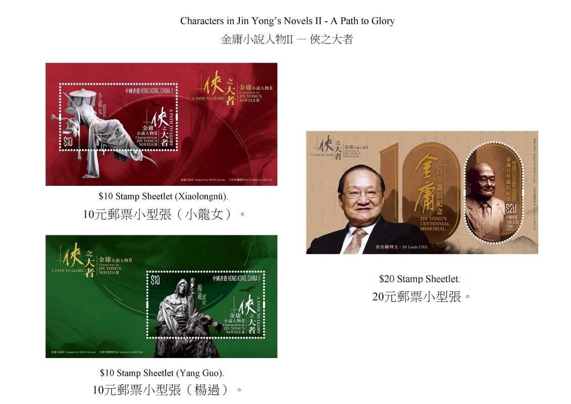 圖為珍藏套裝。 查良鏞自1950年代起以筆名“金庸”創作的15部武俠小說是風靡全球的經典之作,屢次改編成歷久彌新的影視作品。金庸武俠小說的成功,不僅源於其曲折動人的故事情節,更在於書中塑造各具特色的人物。2024年為金庸的百年誕辰,繼2018年發行“金庸小說人物”特別郵票後,香港郵政於今年金庸百年誕辰之際,再度以“金庸小說人物II——俠之大者”為題發行一套6枚郵票、3張郵票小型張及相關集郵品,以著名雕塑家任哲的雕塑作為藍本,呈現金庸筆下部分重要小說人物的全新形象,紀念查良鏞的超卓成就。 “金庸小說人物II——俠之大者”特別郵票的一套6枚郵票及兩張10元郵票小型張,分別展示8個家傳戶曉的金庸小說人物,包括《射雕英雄傳》的郭靖、歐陽鋒和黃蓉,《笑傲江湖》的令狐衝和任我行,《天龍八部》的喬峯,以及《神雕俠侶》的楊過和小龍女。 【編輯:黃璇】