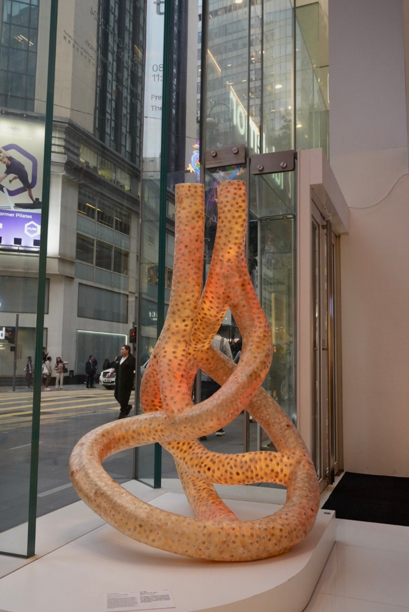 蘇詠寶作品。 蘇詠寶的《達摩克利斯之劍(流動)》(2024年)則透過傳統與現代元素之間的重塑和動感交流,表達她對保護文化遺產和文化意義的追求。蘇詠寶生於香港一個中醫世家,從小開始接觸藥材,更將之當作玩具把玩,長大後藥材卻成為她的藝術作品。木蝴蝶(Damocles)是一種著名藥用樹,結果時樹枝垂下莢果,有點像垂直的劍。當莢果裂開時,圓形的種子猶如帶著薄翼翩翩起舞的蝴蝶那樣隨風而飄。此作品延續了蘇詠寶早期的《流動》系列,以及她對自然界自我調節能力的多層次解讀。另一藝術家卡娜同樣受到大自然啟發,創作了遊走於真實和想像之間的多媒體裝置,以挑戰媒體藝術的可能性。卡娜特別為是次展覽創作了《Fading light in space》,讓觀眾沉浸在經數碼處理的天氣圖表中。作品描繪了一個抽象的敵托邦未來,激發觀眾思考極端天氣帶來的後果。 藝術家兼空間設計師Jacqueline Hen探索人們在現實和網上世界對身體和空間的感知,她以光創造體驗,突出光這個元素如何塑造我們對周圍世界的認識。其裝置藝術作品《Off Grid》利用建築引領觀者思索周圍環境中無形和有形的面向,重新審視他們對空間和光線的感知。Raha Raissnia的作品《ﻧور》(《Nour》)也是從建築、大自然和技術形體中汲取靈感,她利用光揭示時間和空間之間的無形聯繫,並建構穿越過去與現在、記憶與想像的多層次領域。藝術家黎卓華以一種截然不同的方式來審視個人在空間環境中的體驗,她的油畫《被照著的燈》和錄影作品《用三分鐘時間去假裝一張繪畫作品》將一盞普通的檯燈幻化成一個空靈的人影,模糊了物體與自我之間的界限,喚起了人們對熟悉事物的重新想像。