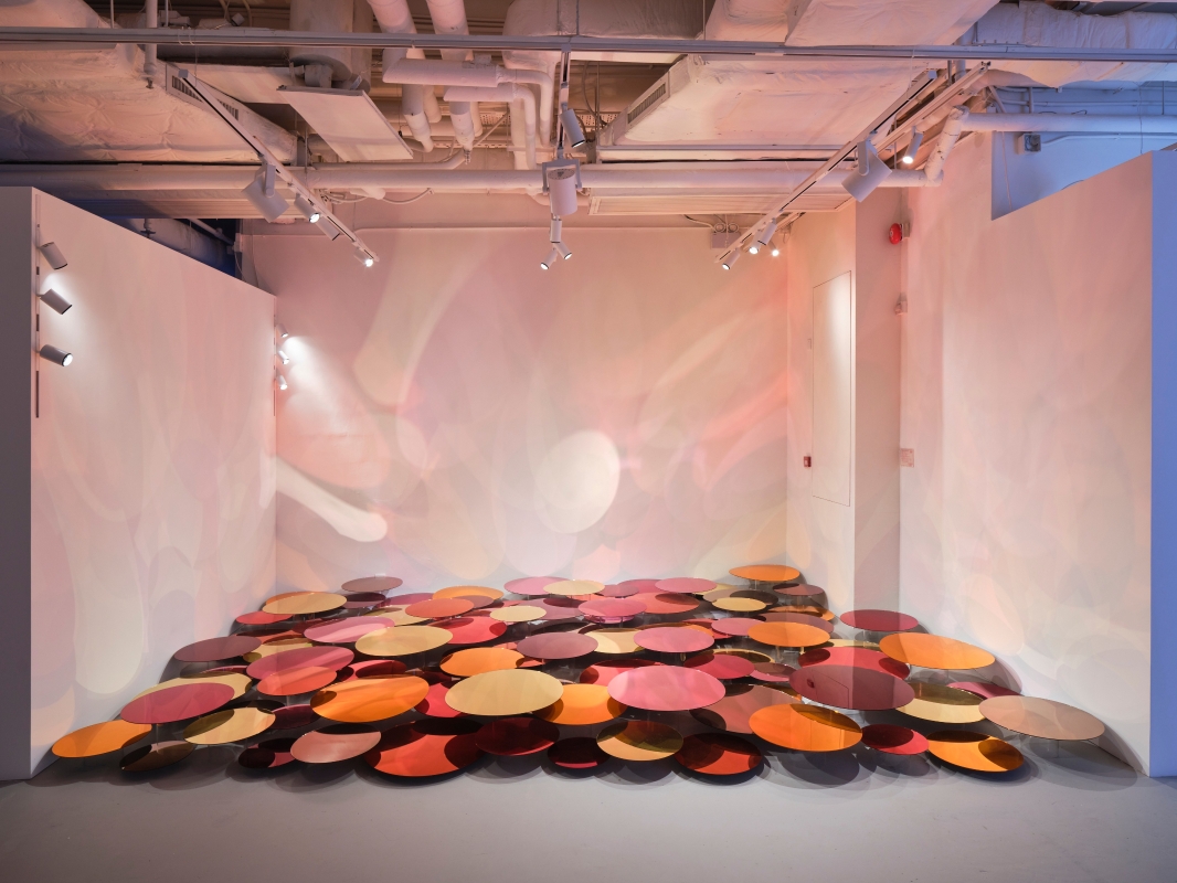 Liz West作品。 Liz West創作的3x5米大型場地特定沉浸式裝置作品《Our Colour Reflection》,以玩味的手法喚起一種新奇感,令人一看著迷。眾多帶有鏡子的圓盤反射光線,形成一系列色調,讓空間沐浴在鮮豔的色彩中,以富有想像的方式將城市的鄉土氣息帶入室內。為觀者帶來多感官體驗,觀者探索裝置時會與自己的倒影相遇,不其然跟建築進行對話,並對光和色彩力量的感官意識變得更強烈,個人的空間體驗亦因而改變。 【編輯:黃璇】