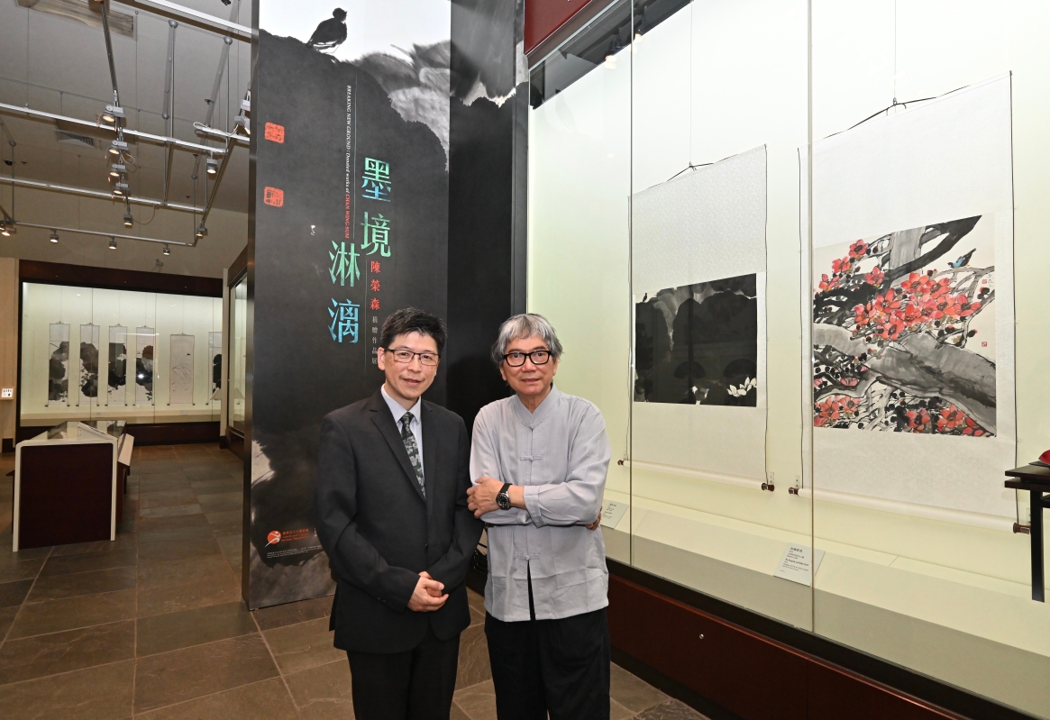 香港文化博物館署理總館長鄧民亮(左)及嶺南畫派畫家陳榮森(右)於展廳合照。
